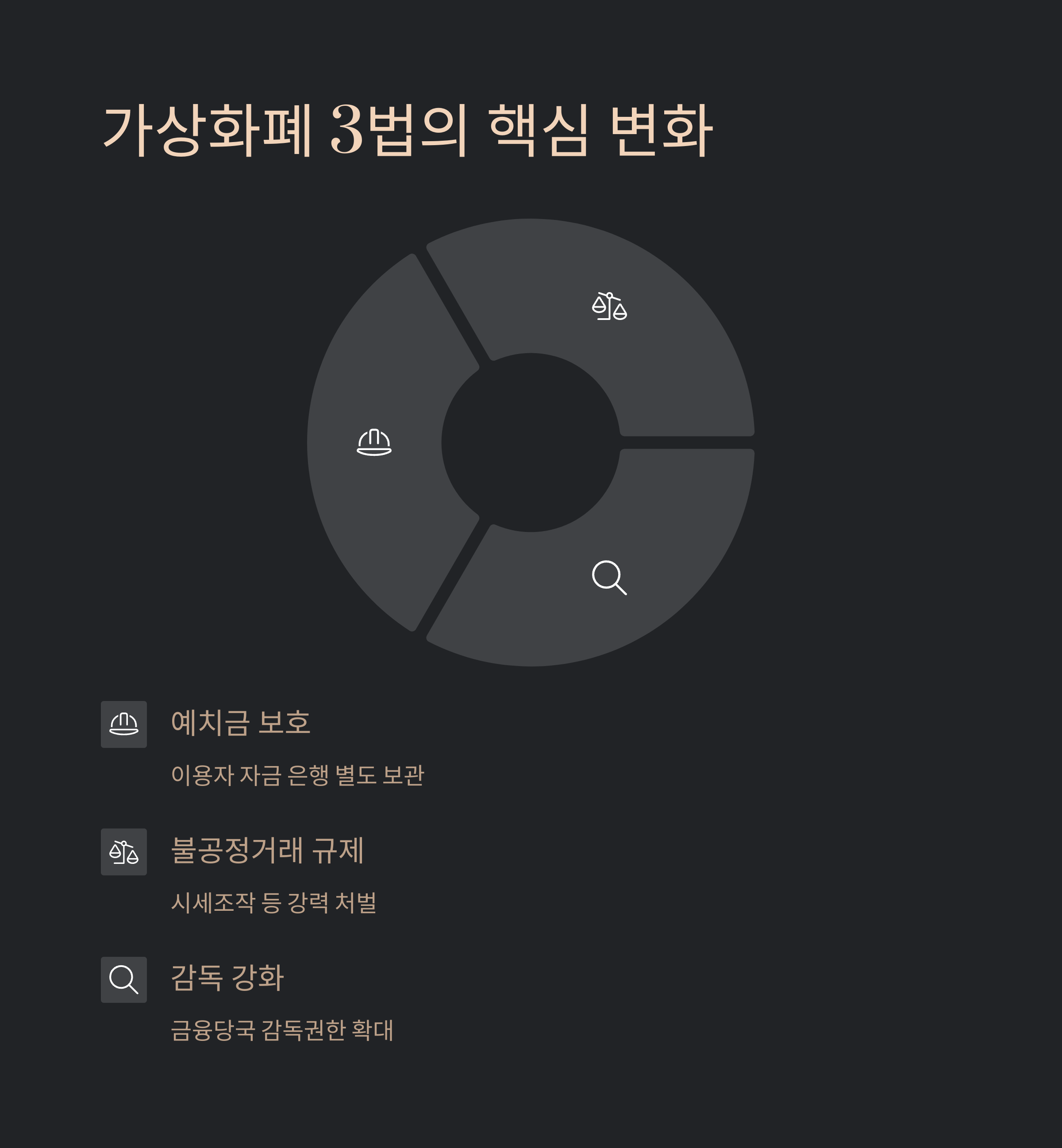 가상화폐 3법의 핵심은 크게 세 가지로 요약할 수 있습니다. 바로 '이용자 예치금 및 가상자산 보호', '불공정거래 행위 규제 강화', 그리고 '금융당국의 감독권한 확대'입니다. 이 세 가지 축을 중심으로 가상자산 시장의 투명성과 안정성이 대폭 강화될 예정입니다.