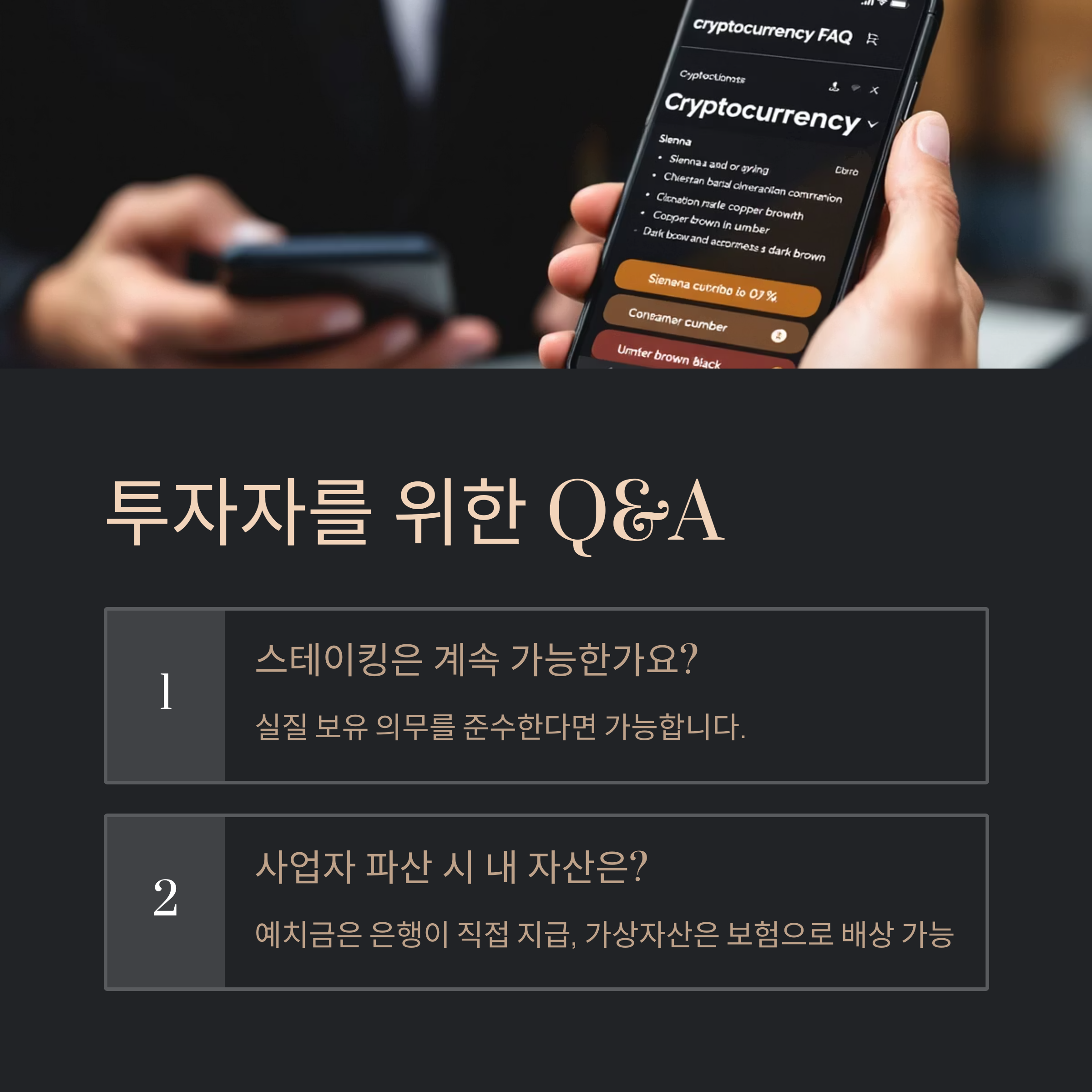 Q1: 가상자산 스테이킹은 이제 할 수 없나요? A1: 아닙니다. 가상자산이용자보호법이 모든 형태의 가상자산 스테이킹을 금지하는 것은 아닙니다. 다만, 가상자산사업자는 이용자로부터 위탁받은 가상자산과 동일한 종류와 수량의 가상자산을 실질적으로 보유해야 하는 의무가 있습니다. 따라서 제3자에게 이용자의 가상자산을 이전하는 형태의 예치·운용, 스테이킹 등은 제한될 수 있습니다. 즉, 실질 보유 의무를 준수한다면 스테이킹은 가능합니다.