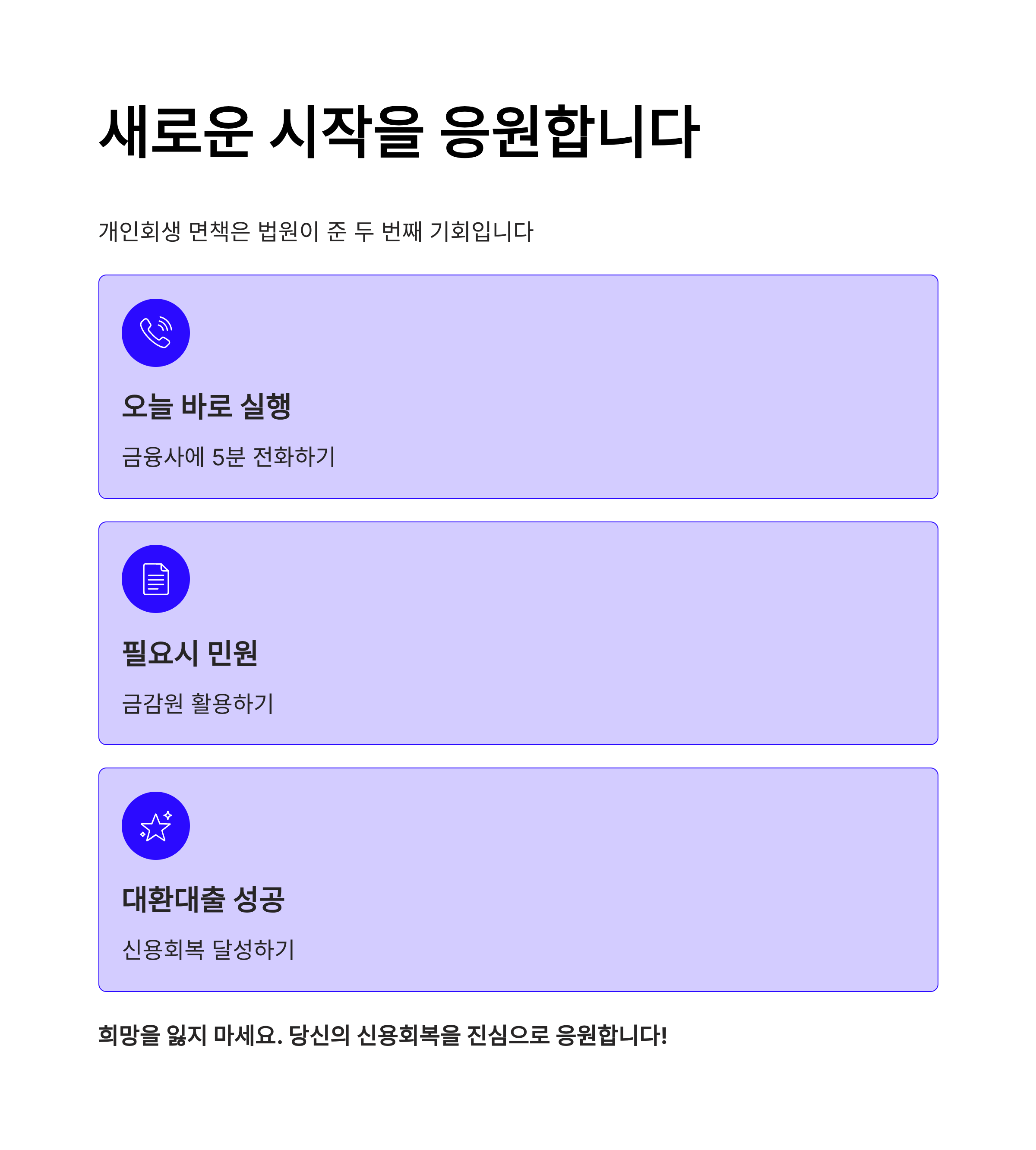 개인회생 면책은 새로운 삶을 위한 법원의 배려입니다. 잔존하는 장기연체기록 때문에 희망을 잃지 마시고, 오늘 알려드린 1단계 (금융사 요청)와 2단계 (금감원 민원)를 통해 반드시 대환대출에 성공하시기를 바랍니다. 당신의 신용회복을 응원합니다!