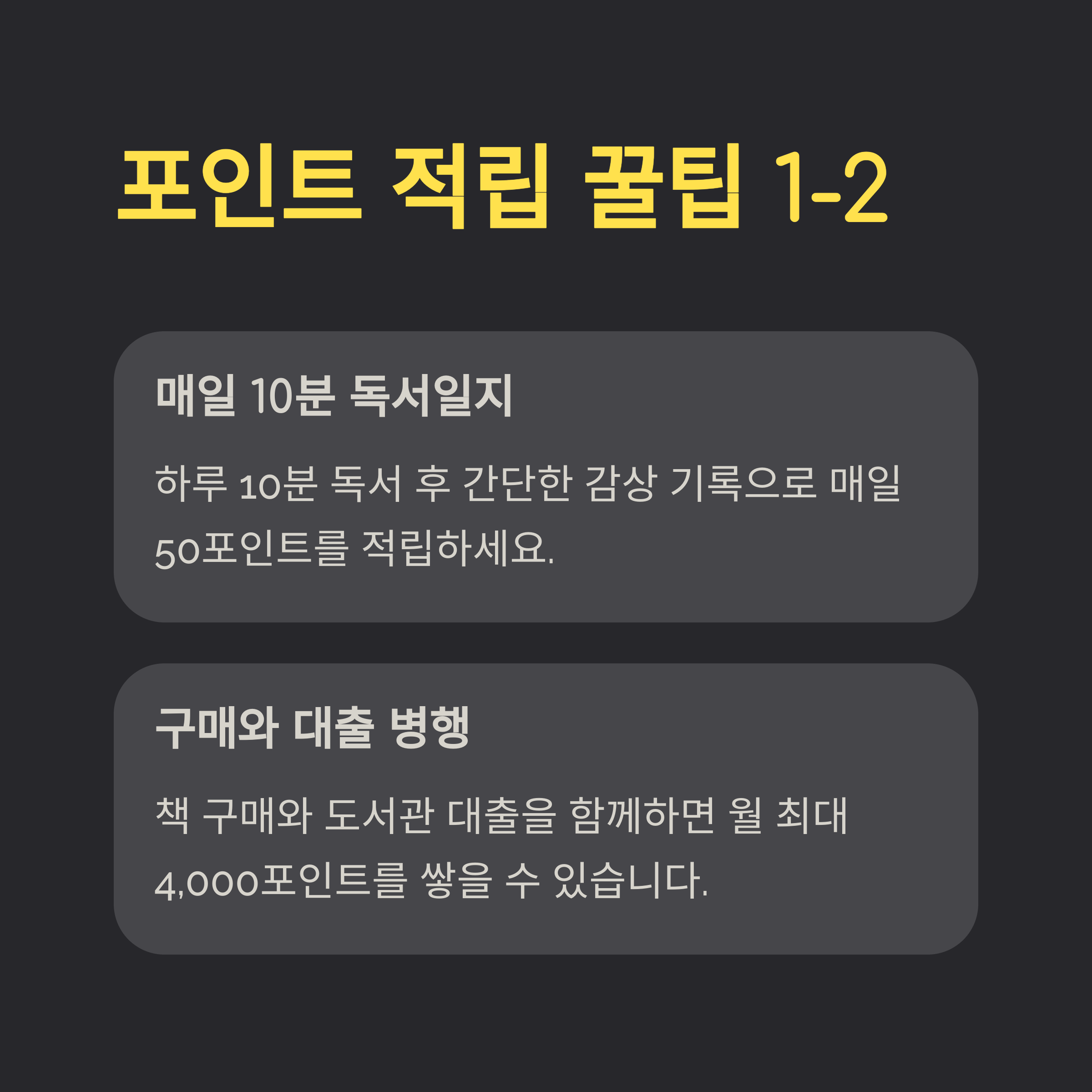 월 1권 구매(2,000포인트) + 도서관 대출 2권(권당 1,000포인트)으로 월 최대 4,000포인트 적립.