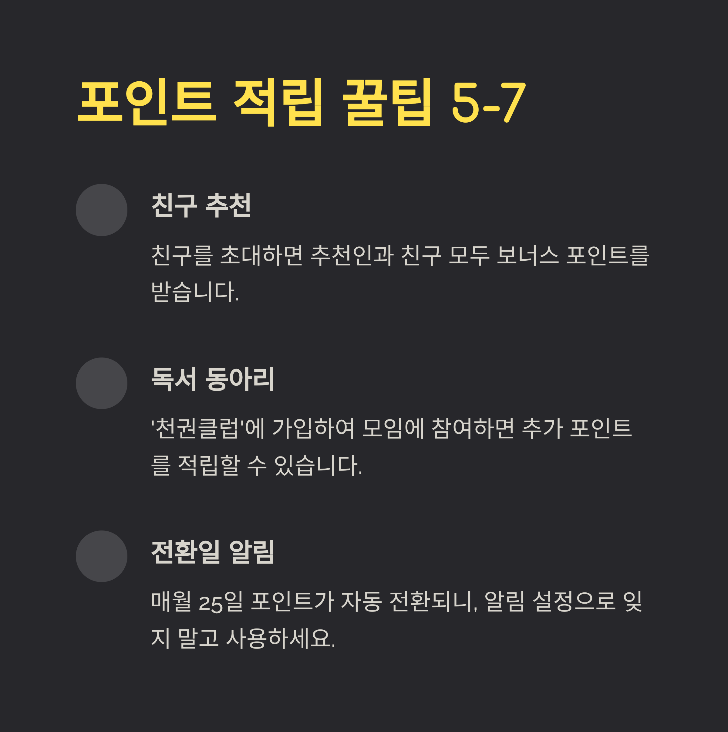 - 추가 혜택: 가입 시 '축하 포인트', 추천인 보너스, 21일 출석체크 챌린지 보상으로 추가 포인트 획득 가능.