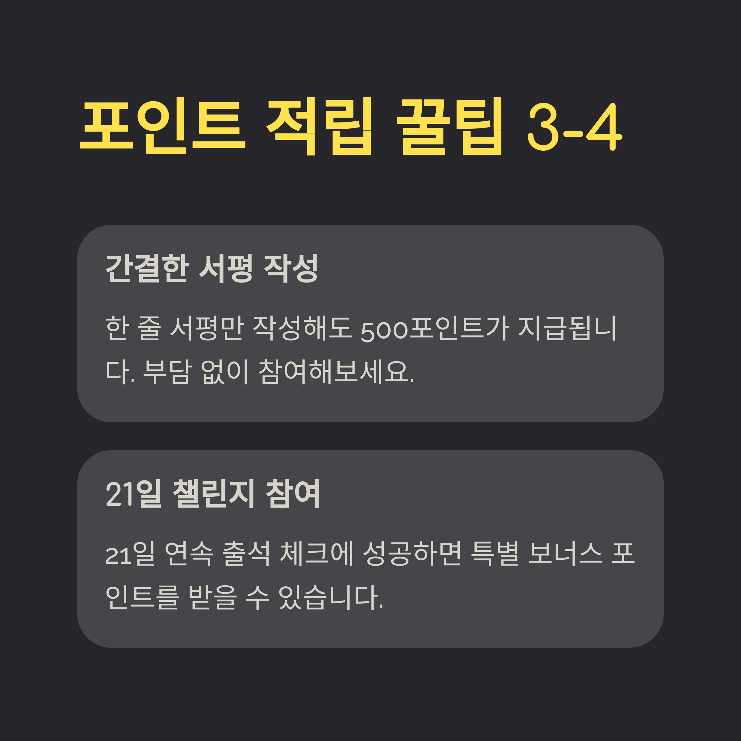 하루 50포인트로 누적 적립이 가능합니다. 아침이나 잠자리 전 고정 시간을 정해 간단한 감상만 기록하세요.