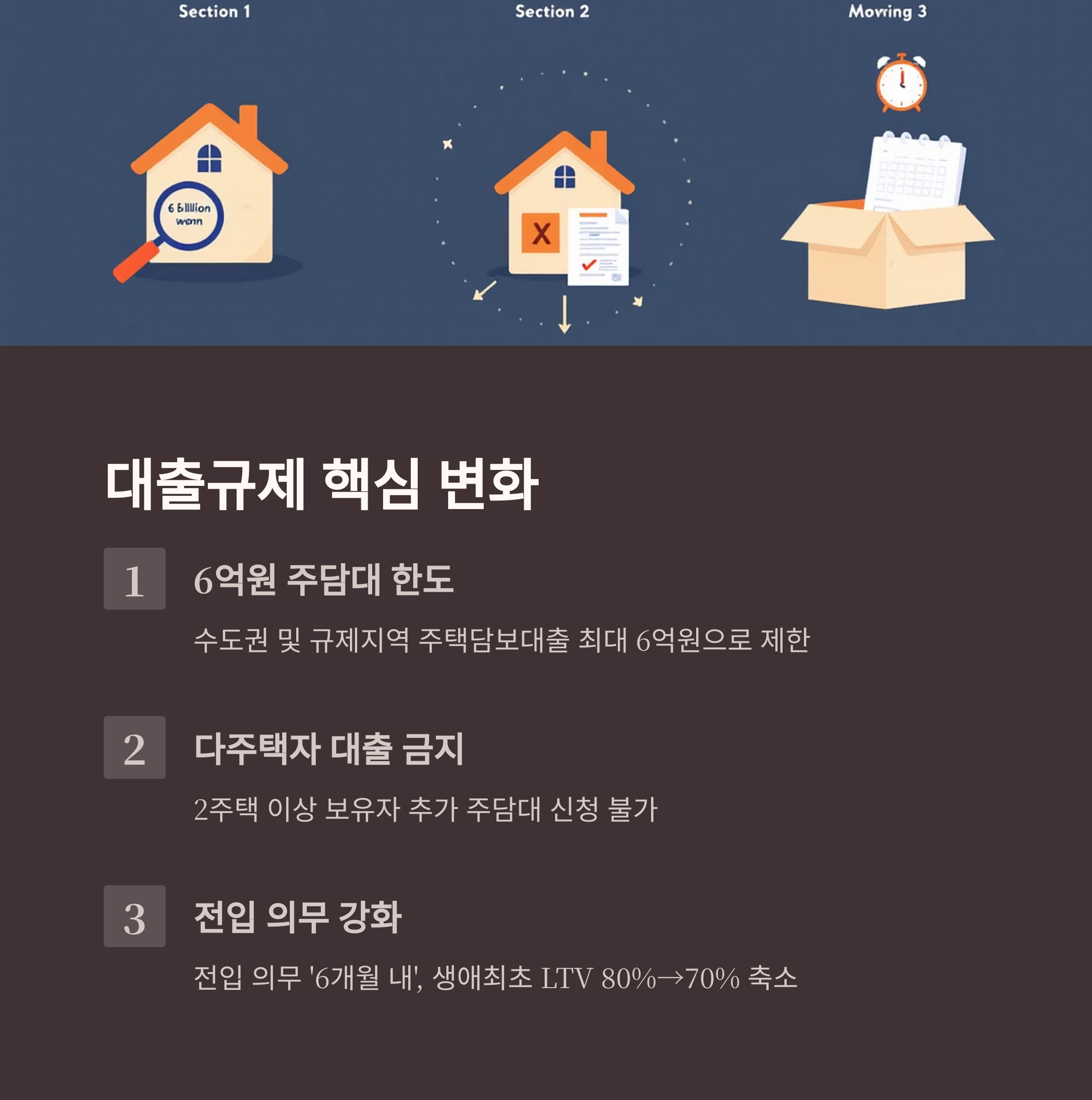 2주택 이상 보유자는 추가 주담대 신청이 불가능하며, 1주택자도 일정 조건 미달 시 동일한 규제를 받습니다 . - 전입 의무 강화 및 생애최초 LTV 축소