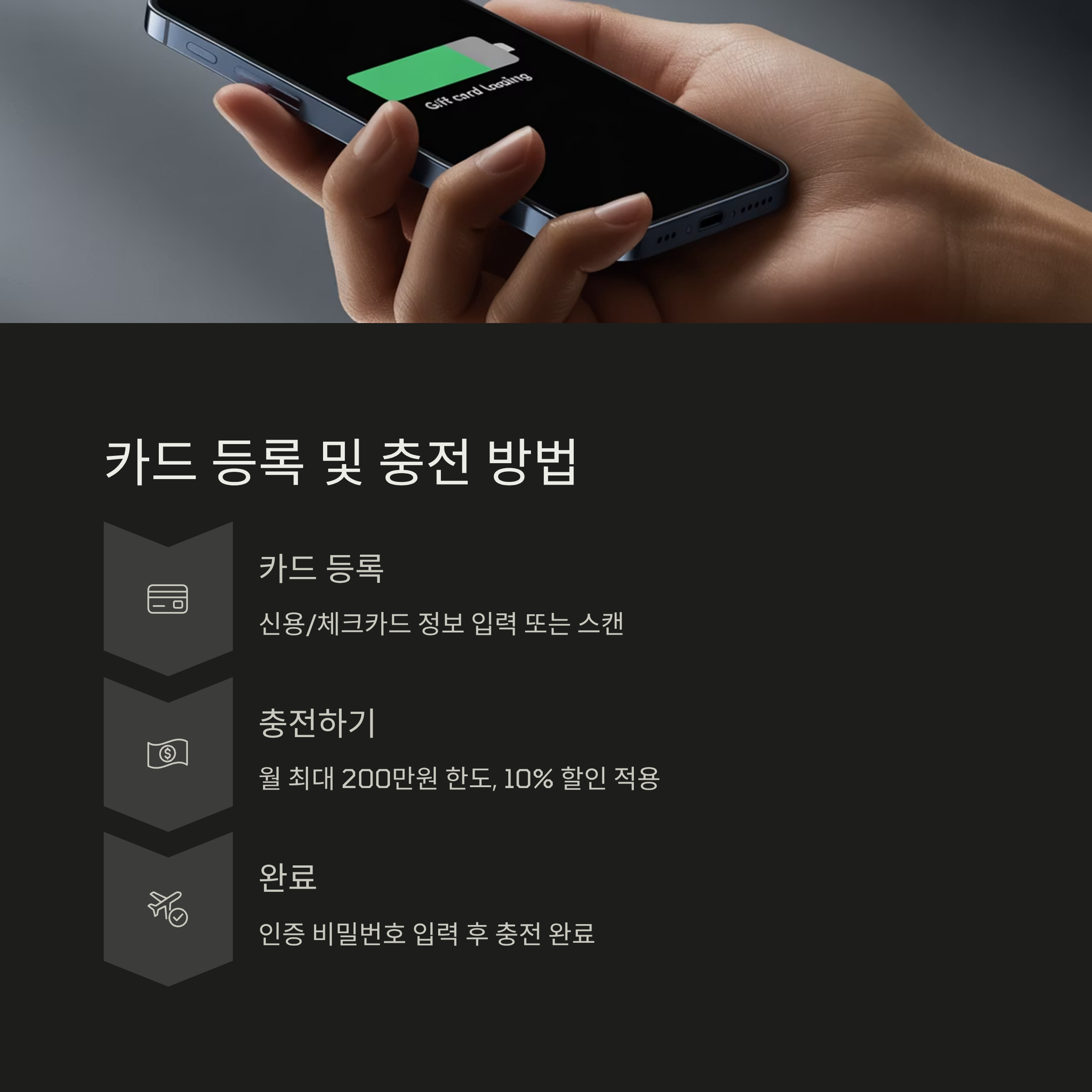 - 상품권 충전하기: 이제 홈 화면의 '충전' 버튼을 누르고, 충전하고 싶은 금액을 선택합니다. 월 최대 200만 원 한도 내에서 충전할 수 있으며, 충전 시 10%의 할인이 자동으로 적용됩니다. 예를 들어, 10만 원을 충전하면 9만 원만 결제되는 식이죠. 충전할 계좌를 선택하고 인증 비밀번호를 입력하면 충전이 완료됩니다.