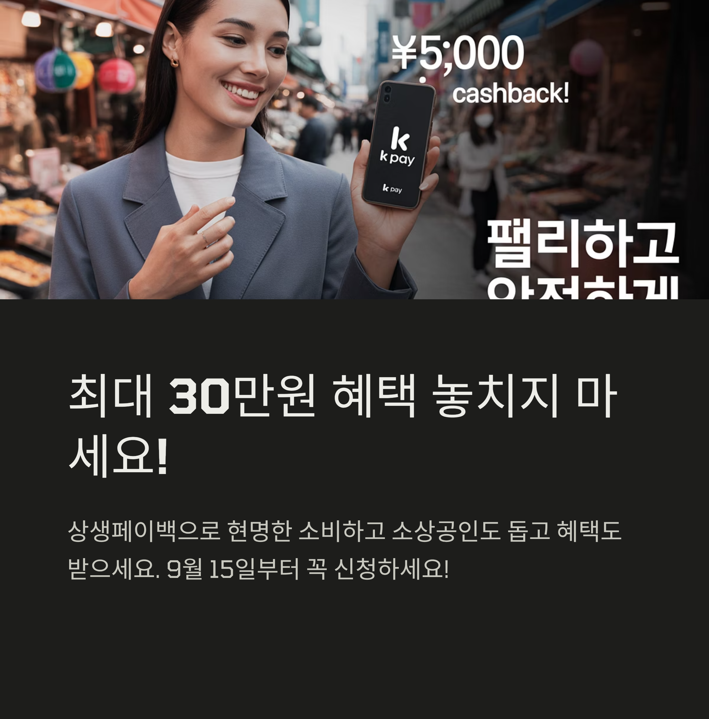 - 신청 방법: 상생페이백 누리집(상생페이백.kr)을 통한 온라인 신청 (온라인 신청이 어려울 경우, 전통시장 상인회, 소상공인지원센터, 은행 창구 방문)