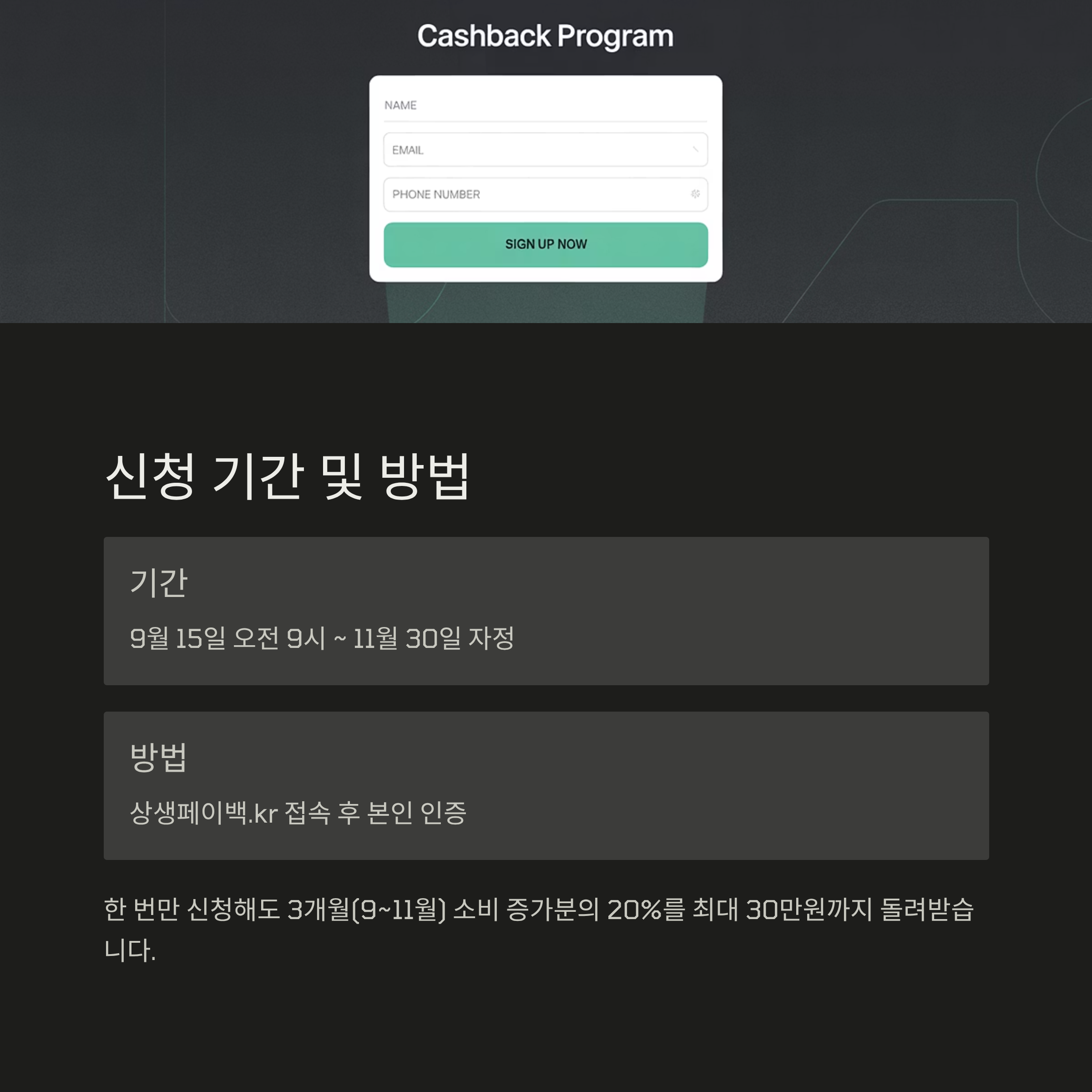 Q. 9월에 신청하지 못하면 10월, 11월 소비분은 못 받나요? A. 아닙니다. 신청 기간인 9월 15일부터 11월 30일 사이에 한 번만 신청하면 3개월치 소비 증가분에 대한 페이백을 모두 받을 수 있습니다. 늦게 신청해도 이미 사용한 소비 금액은 소급 적용됩니다.