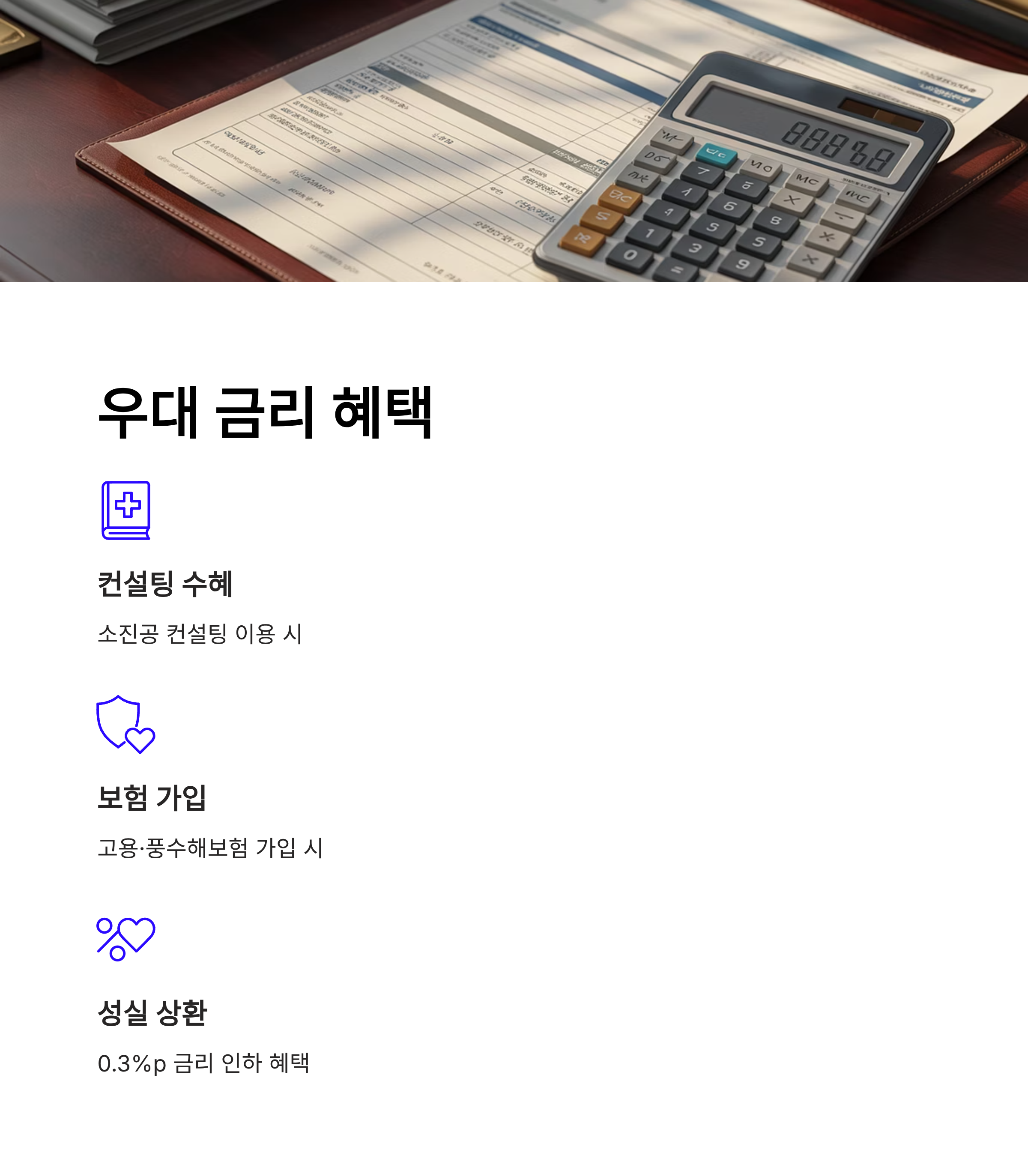 기본 금리 외에도 소진공 컨설팅을 받거나, 자영업자 고용보험, 풍수해보험 등 사회 안전망에 가입한 경우 우대 금리를 적용받을 수 있습니다. 또한, 성실하게 상환하는 분들에게는 0.3%p의 금리 인하 혜택까지 제공되므로, 혜택을 최대한 활용하는 것이 좋습니다.