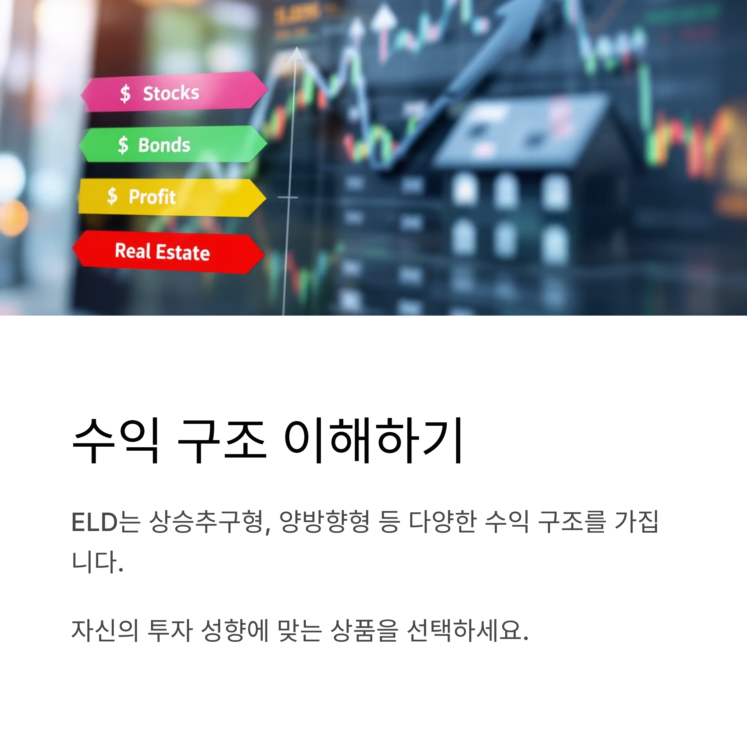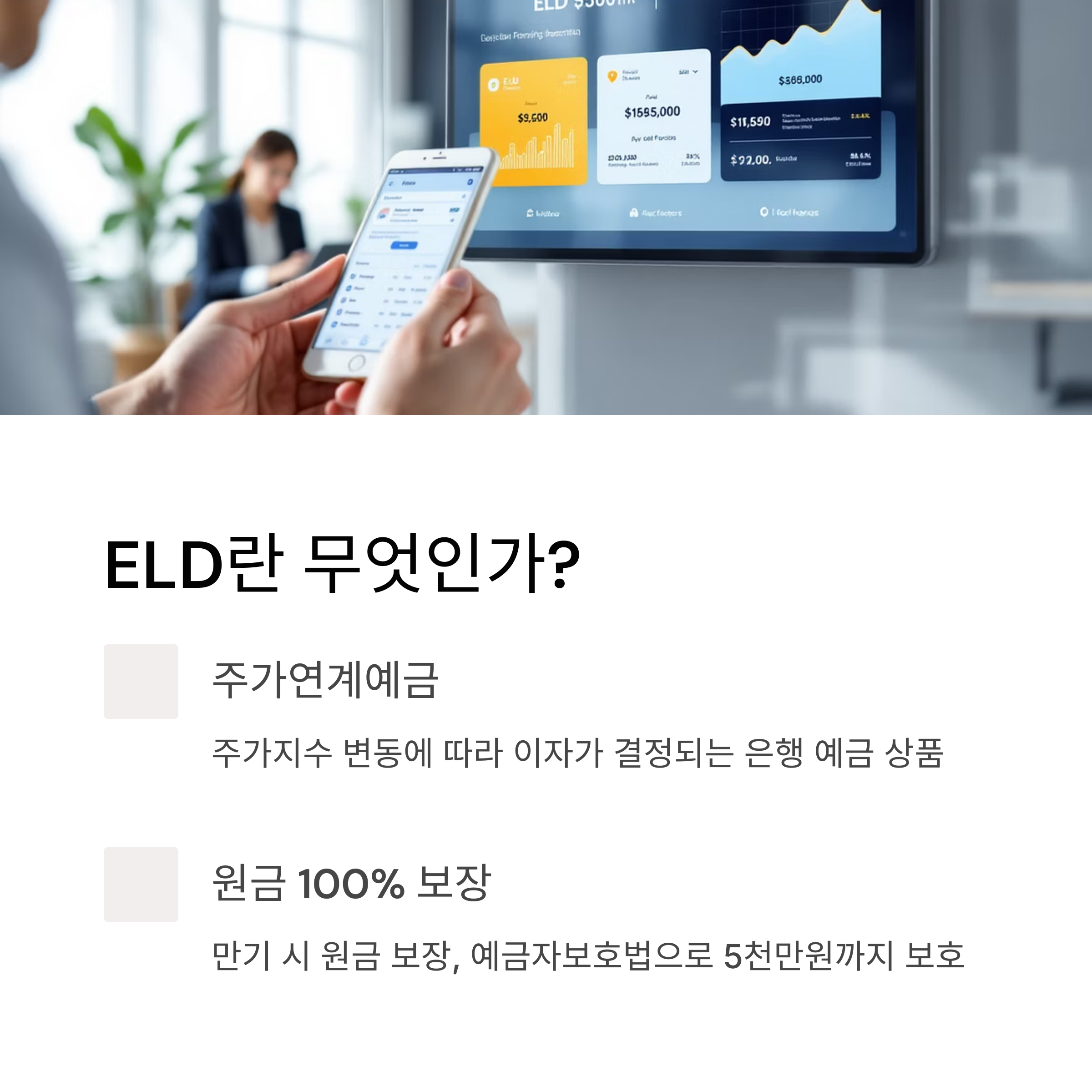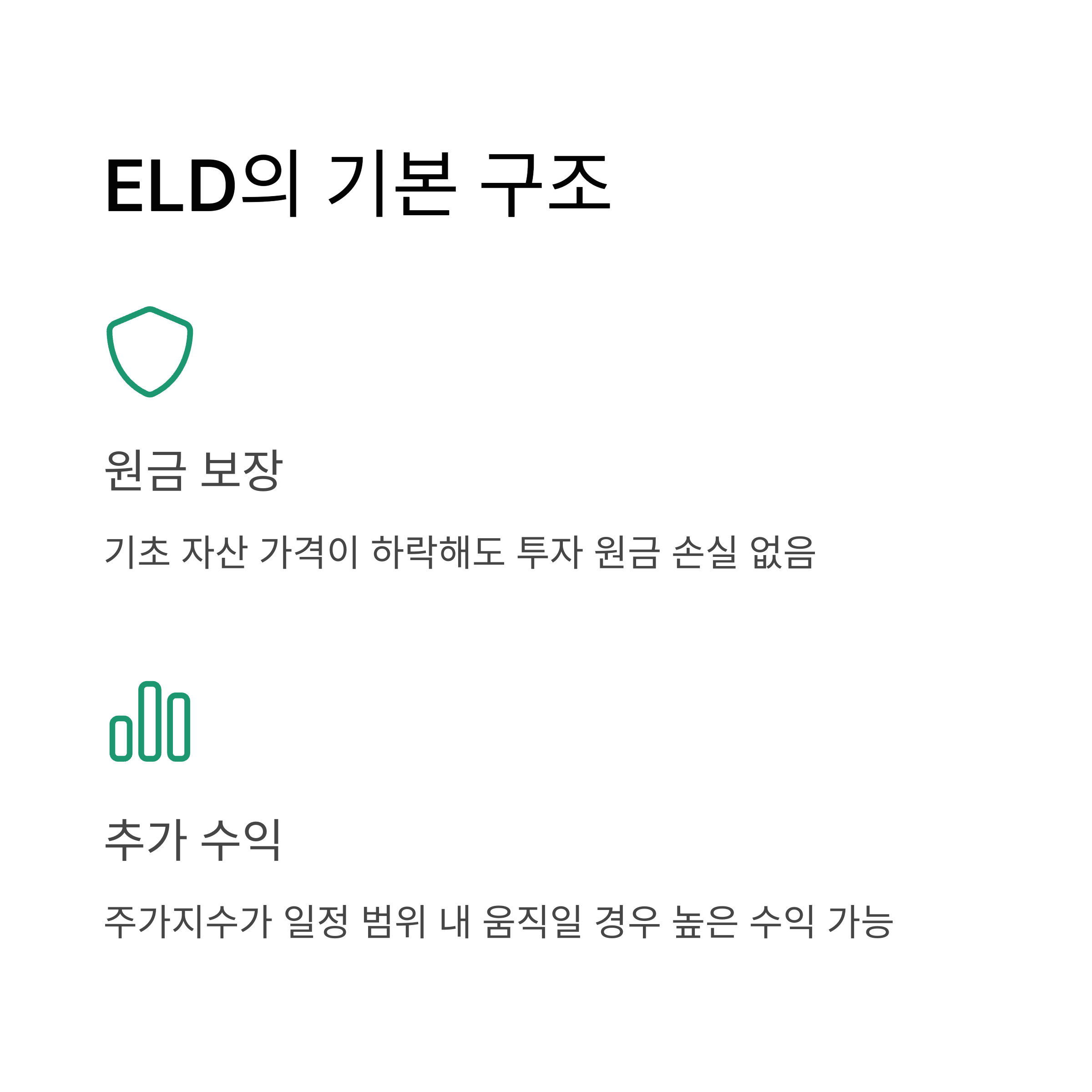- 원금 보장: ELD는 만기 시 원금이 보장되므로, 기초 자산의 가격이 하락하더라도 투자 원금을 잃지 않습니다.
