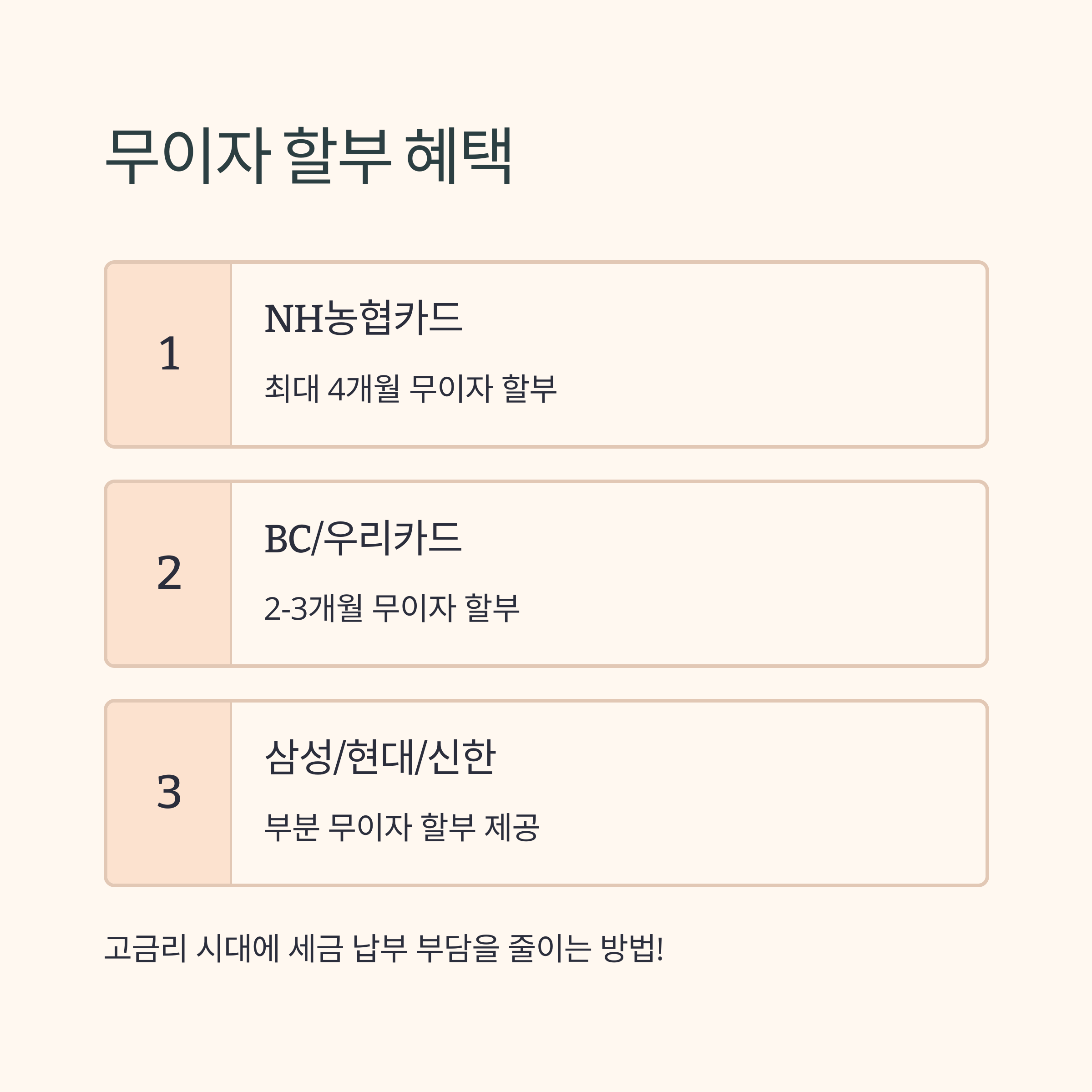 1. 무이자 할부로 부담 없이 분할 납부! 재산세 액수가 부담스럽다면 무이자 할부를 적극적으로 활용해 보세요. 대부분의 카드사에서 2~3개월 무이자 할부를 기본으로 제공하며, 일부 카드사의 경우 5만원 이상 결제 시 최대 4개월 무이자 할부 혜택을 제공하기도 합니다. 고금리 시대에 세금 납부 부담을 줄일 수 있는 가장 좋은 방법이죠. 카드사별로 무이자 할부 기간과 조건(예: 특정 개월 수만 부분 무이자)이 다를 수 있으니, 납부 전에 반드시 해당 카드사 홈페이지나 앱을 통해 최신 정보를 확인하는 것이 중요합니다. 예를 들어, NH농협카드는 최대 4개월 무이자 할부를, BC카드와 우리카드는 2~3개월 무이자 할부 혜택을 제공하며, 삼성카드, 현대카드, 신한카드 등도 부분 무이자 할부 또는 특정 조건의 무이자 할부 혜택을 제공하고 있습니다.