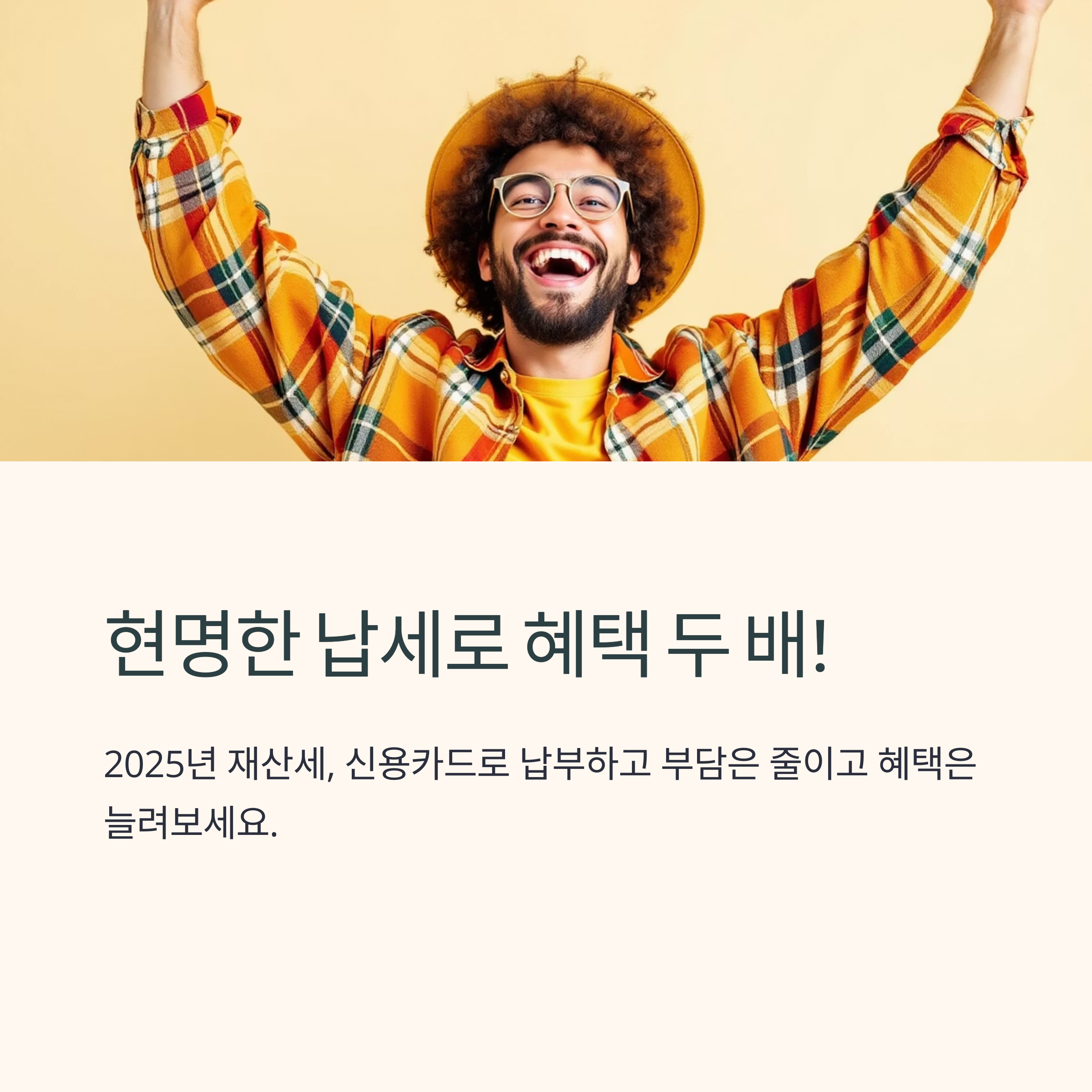 재산세는 매년 내야 하는 정기적인 세금인 만큼, 납부 방법을 현명하게 선택하는 것이 중요합니다. 2025년 재산세 납부 시에는 오늘 알려드린 신용카드 혜택과 절세 팁들을 잘 활용하셔서 부담은 줄이고 혜택은 2배로 늘려보시길 바랍니다!