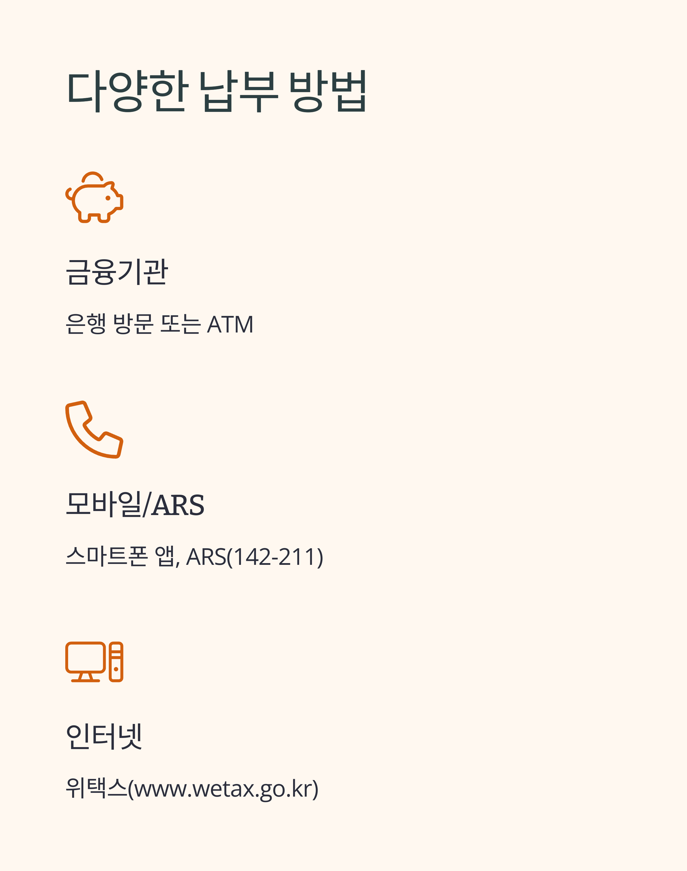 납부 방법은 정말 다양해요. 금융기관 방문은 물론, ARS 자동응답 서비스(142-211), 인터넷 지방세 납부 시스템 위택스(www.wetax.go.kr), 스마트폰 앱(서울시 세금납부, 스마트 위택스 등), 그리고 각 금융기관의 ATM 기기를 통해서도 간편하게 납부할 수 있답니다. 여기서 중요한 점은 바로 신용카드를 활용하는 것이죠! 재산세는 신용카드로 납부해도 별도의 납부대행 수수료가 발생하지 않는다는 사실, 알고 계셨나요? 이 때문에 카드사별 혜택을 잘 활용하면 더욱 이득을 볼 수 있어요.
