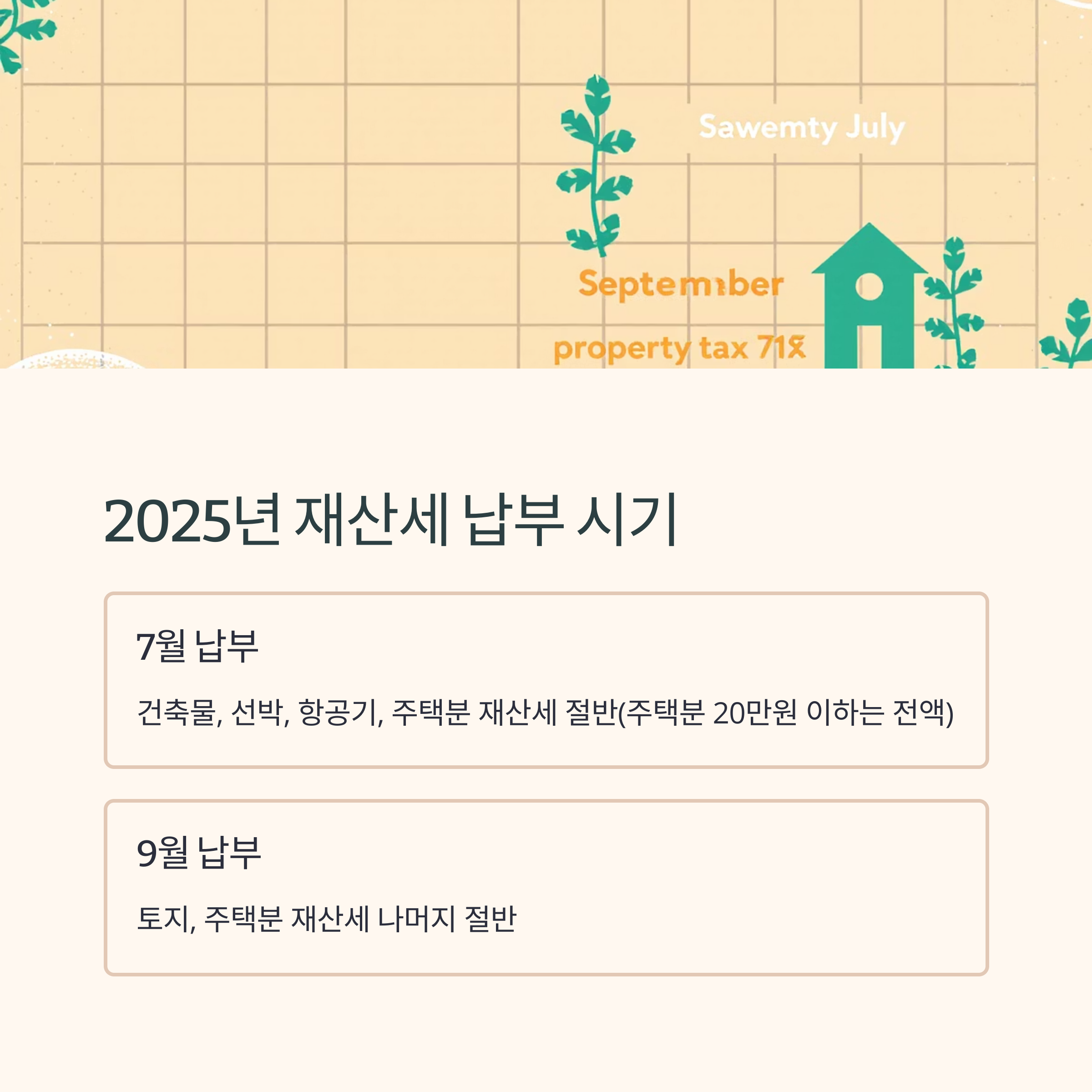 재산세는 매년 6월 1일 현재 주택, 건축물, 토지 등을 소유한 사람에게 부과되는 세금이에요. 2025년에는 재산세 납부 시기가 세목에 따라 조금씩 달라지니 꼭 확인해두셔야 합니다.