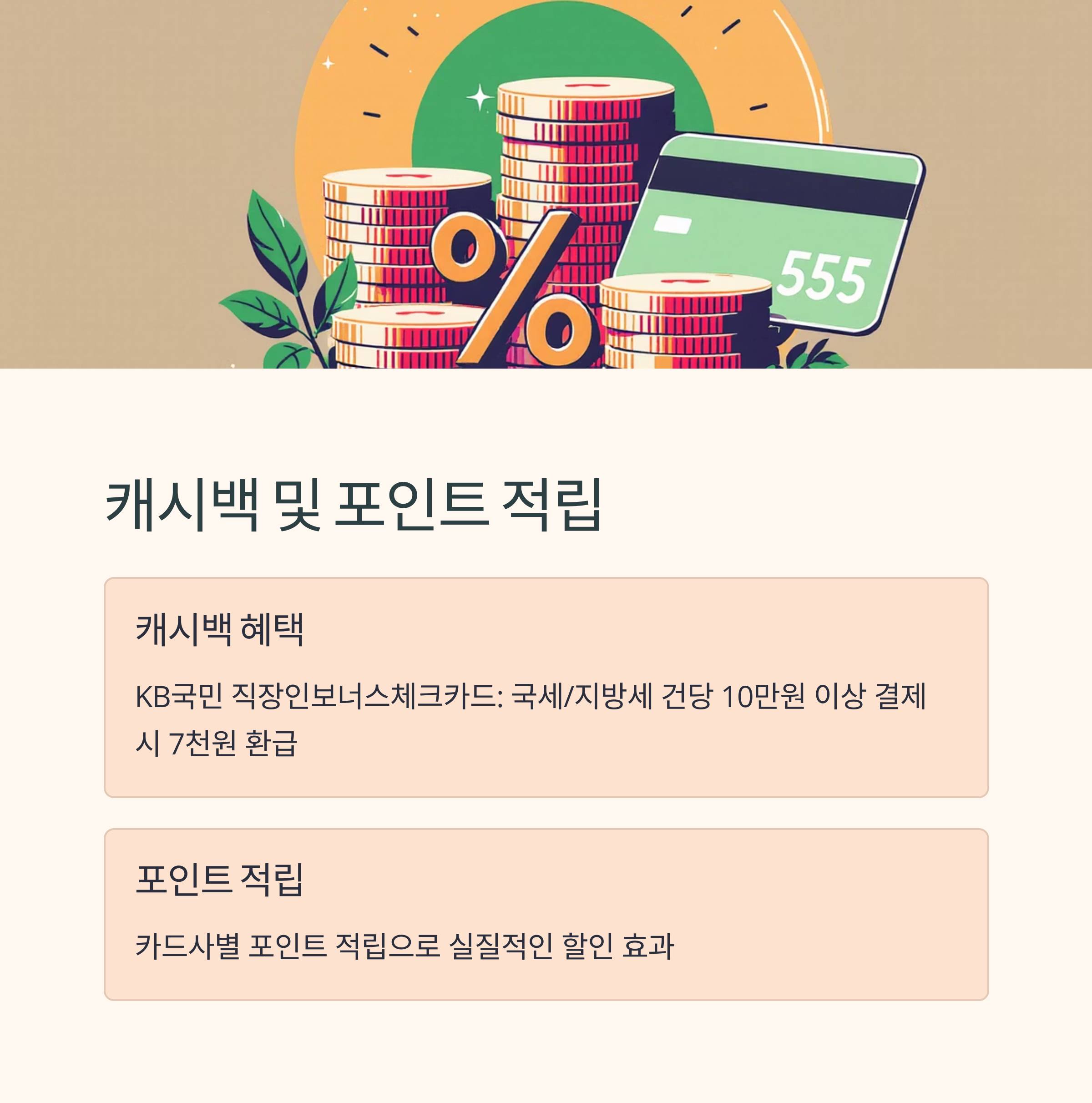 예를 들어, KB국민 직장인보너스체크카드는 국세/지방세 건당 10만원 이상 결제 시 7천원 환급 할인을 제공하는 등의 혜택이 있습니다. 카드사 이벤트 페이지를 꼼꼼히 살펴보면 예상치 못한 혜택을 발견할 수 있으니, 납부 전에 꼭 확인해 보세요. 적립된 포인트는 카드 대금 납부나 다른 쇼핑에 활용할 수 있어 실질적인 절세 효과를 누릴 수 있답니다.