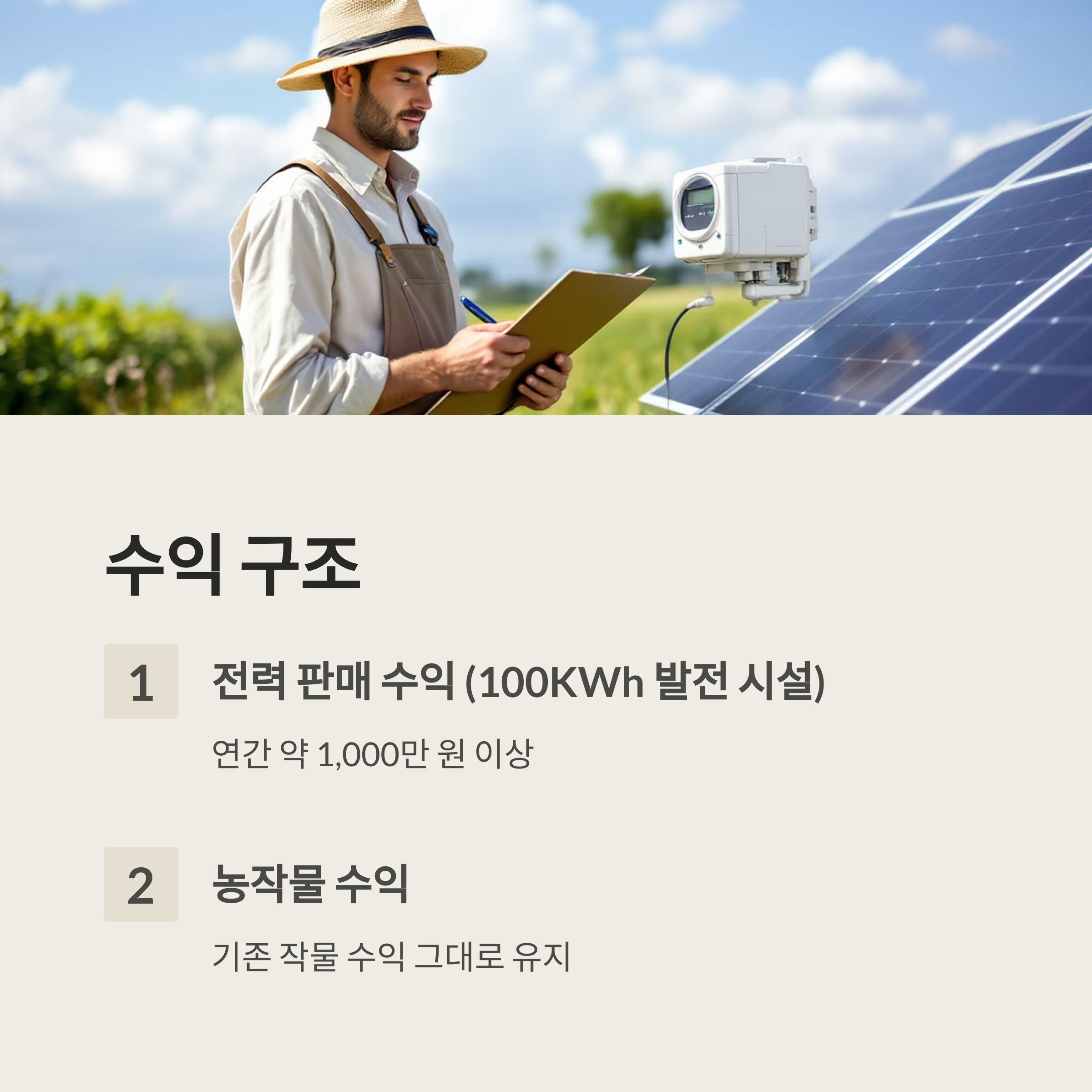 수익은 기본적으로 전기를 생산해서 한전에 판매하는 방식입니다. FIT(고정가격매입제도)를 활용하면 20년간 안정적인 수익이 보장되죠. 동시에 농작물도 수확하니, 말 그대로 수익이 두 배로 늘어나는 셈이죠. 여기 간단한 수익 모델 구성을 정리해볼게요.