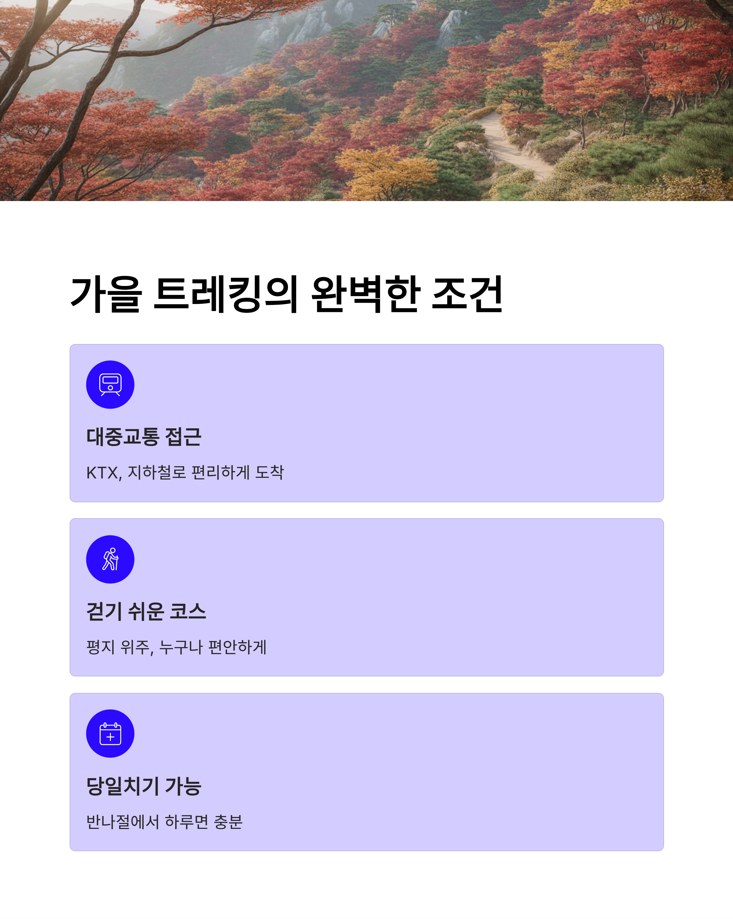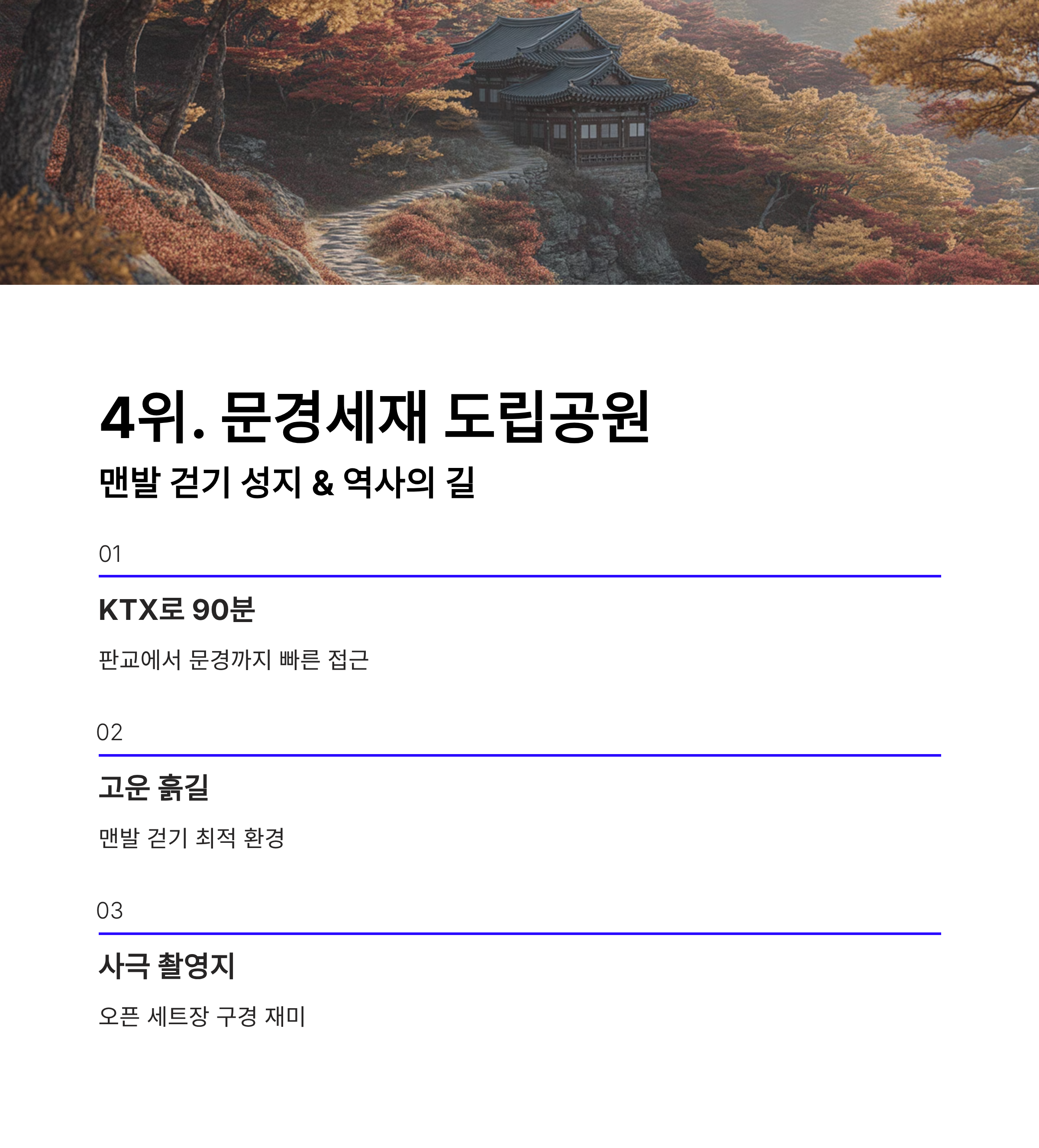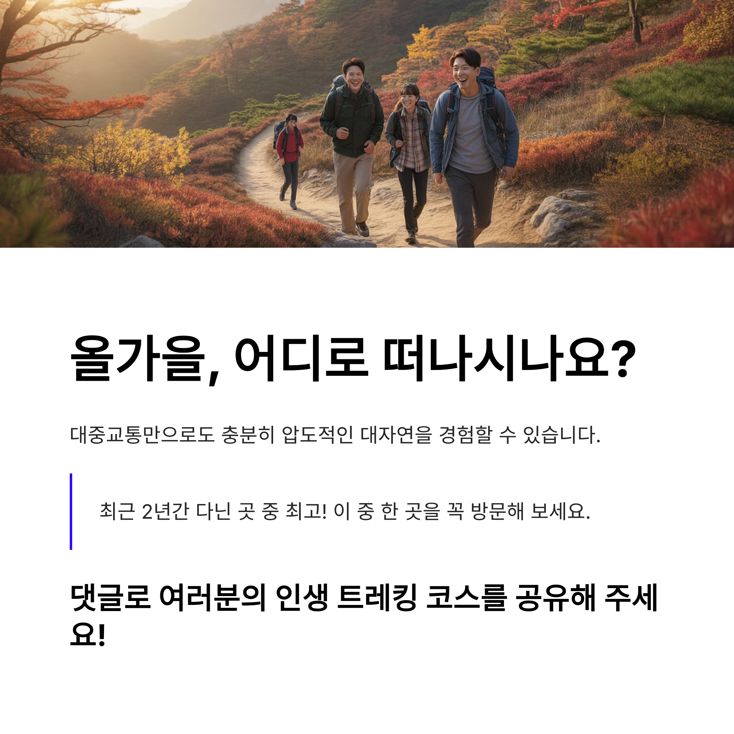 그래서 오늘은 제가 직접 경험하고, 대중교통으로도 충분히 당일치기 여행이 가능하며, 걷기 쉽고 주변 인프라까지 갖춘 국내 트레킹 여행지 TOP 5를 엄선해서 소개해 드리려 합니다. 순위가 올라갈수록 제가 더 강력하게 추천하는 '인생 가을 여행지'이니, 올가을 어디로 떠날지 고민이시라면 스크롤을 끝까지 놓치지 마세요!