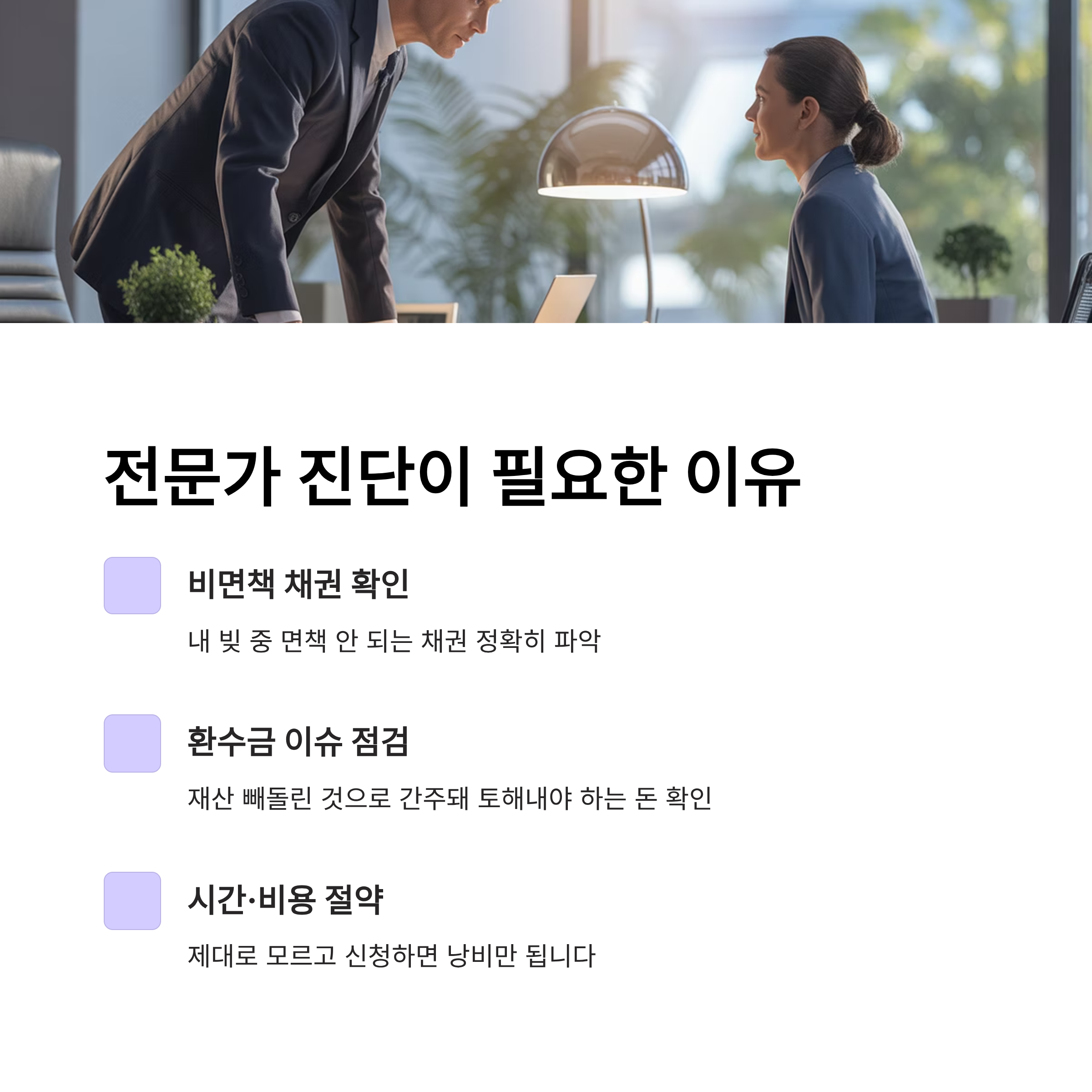 파산은 모든 빚을 털어내고 새 삶을 살기 위한 도구이지만, 제대로 알지 못하고 신청하면 시간과 비용만 낭비하는 꼴이 됩니다. 특히 내 빚 중에 비면책 채권이 섞여 있는지, 혹은 파산보다 더 무서운 '환수금(재산을 빼돌린 것으로 간주해 토해내야 하는 돈)' 이슈는 없는지 전문가와 상의하는 것이 안전합니다.