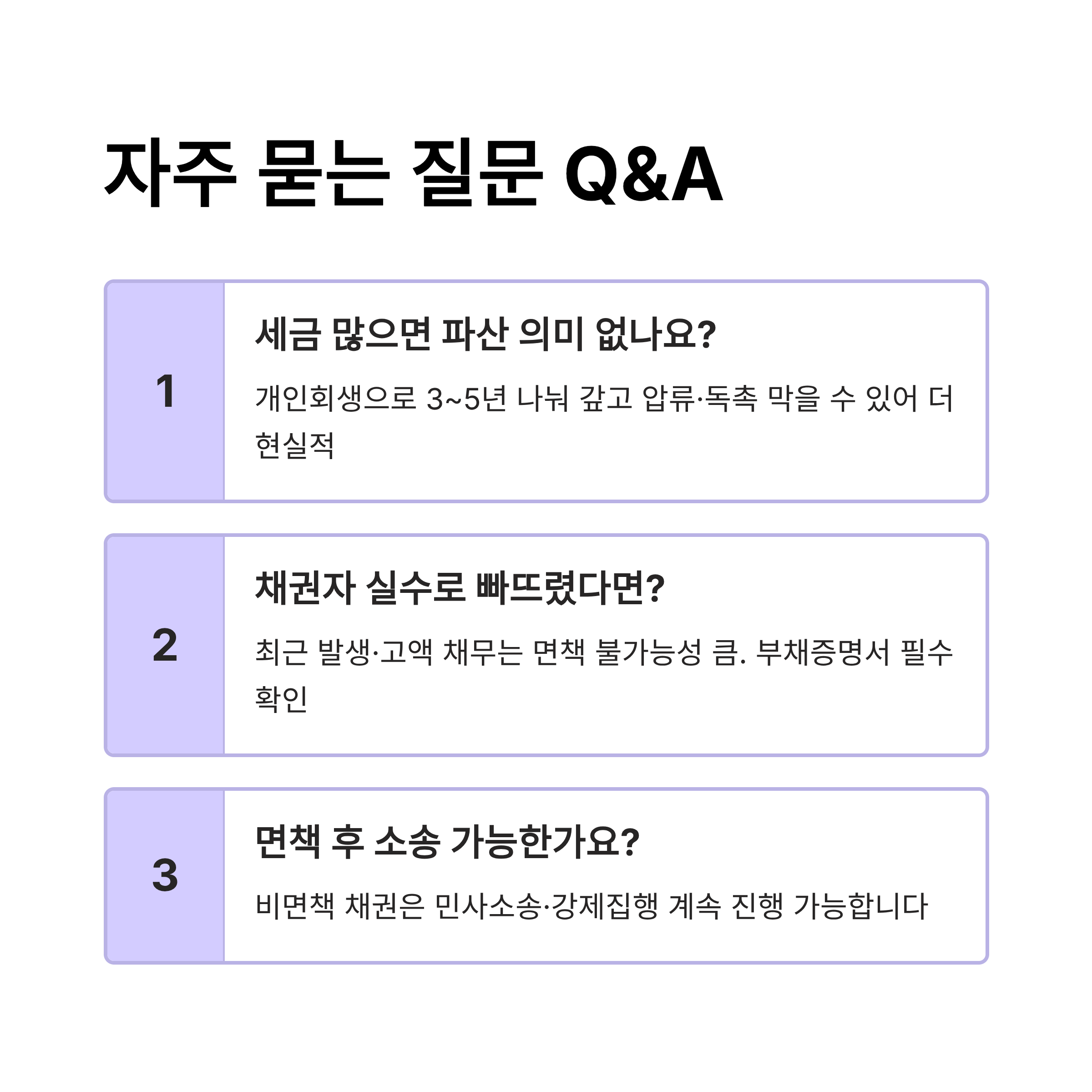 A1. 파산으로는 세금을 탕감받을 수 없습니다. 하지만 개인회생을 신청하면 세금을 '우선 변제 채권'으로 설정하여 3~5년 동안 원금을 나누어 갚을 수 있고, 그동안의 압류나 독촉을 막을 수 있어 훨씬 현실적인 대안이 됩니다.