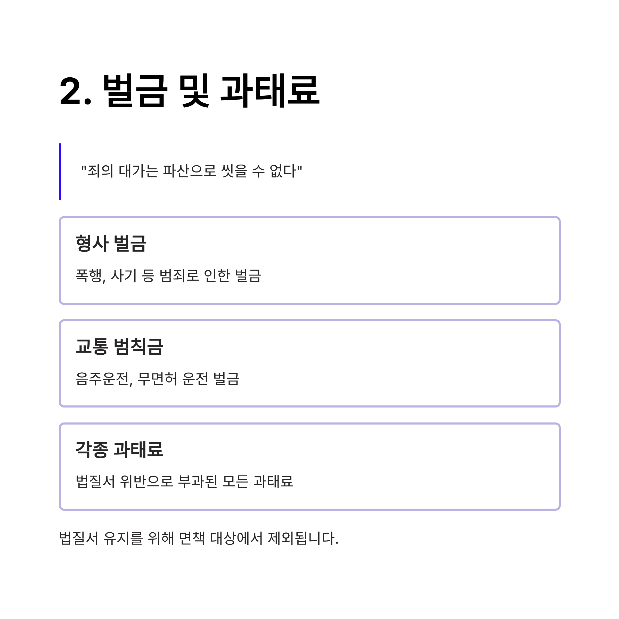 상식적으로 생각해 볼까요? 법을 어겨서 받은 처벌(빚)을 파산으로 없애준다면 아무도 법을 지키지 않겠죠. 따라서 사법 질서의 근간을 유지하기 위해 다음 항목들은 면책되지 않습니다.