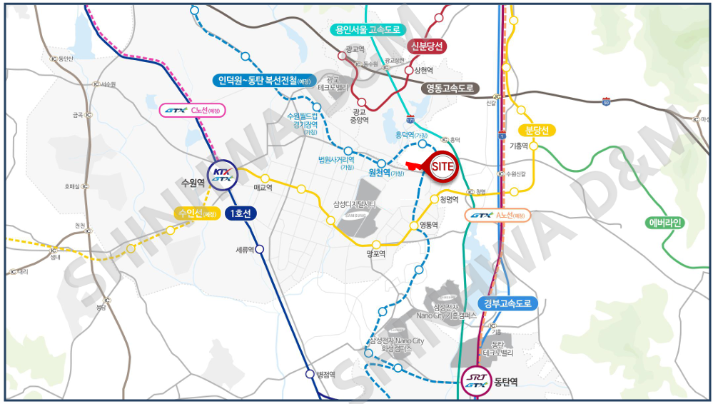신광교 클라우드시티는 삼성전자 디지털시티와 인접한 삼성삼거리 앞에 위치해 있어, 비즈니스적으로 중요한 위치에 자리하고 있습니다. 주요 고속도로와 가까운 위치도 큰 장점입니다. 경부고속도로 수원신갈 나들목(IC)까지는 약 4.7km, 용서고속도로 흥덕 IC는 2.9km, 영동고속도로 동수원 IC는 5.7km 떨어져 있어, 수도권 내 이동이 편리합니다.