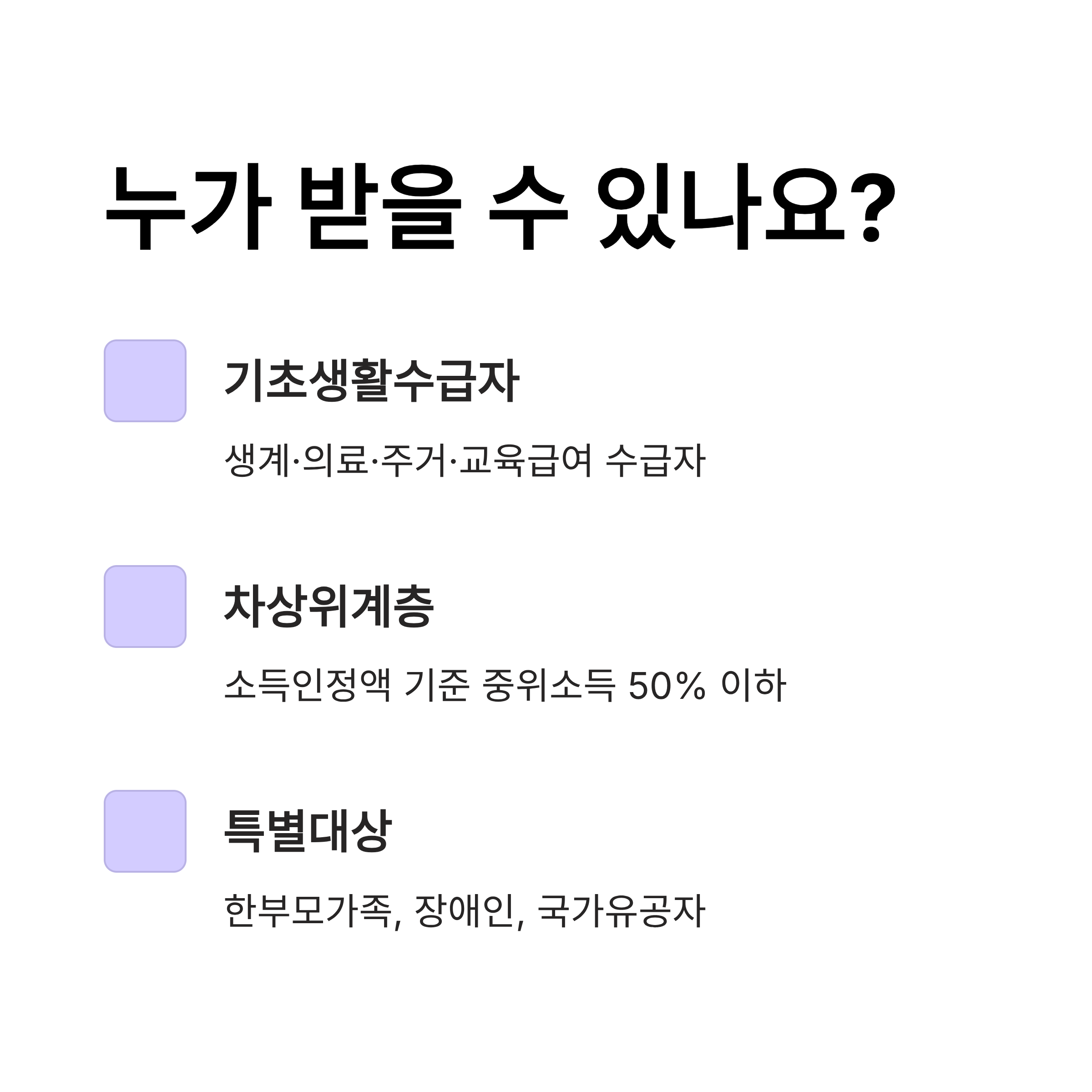 - 차상위계층: 소득인정액이 기준 중위소득 50% 이하인 가구