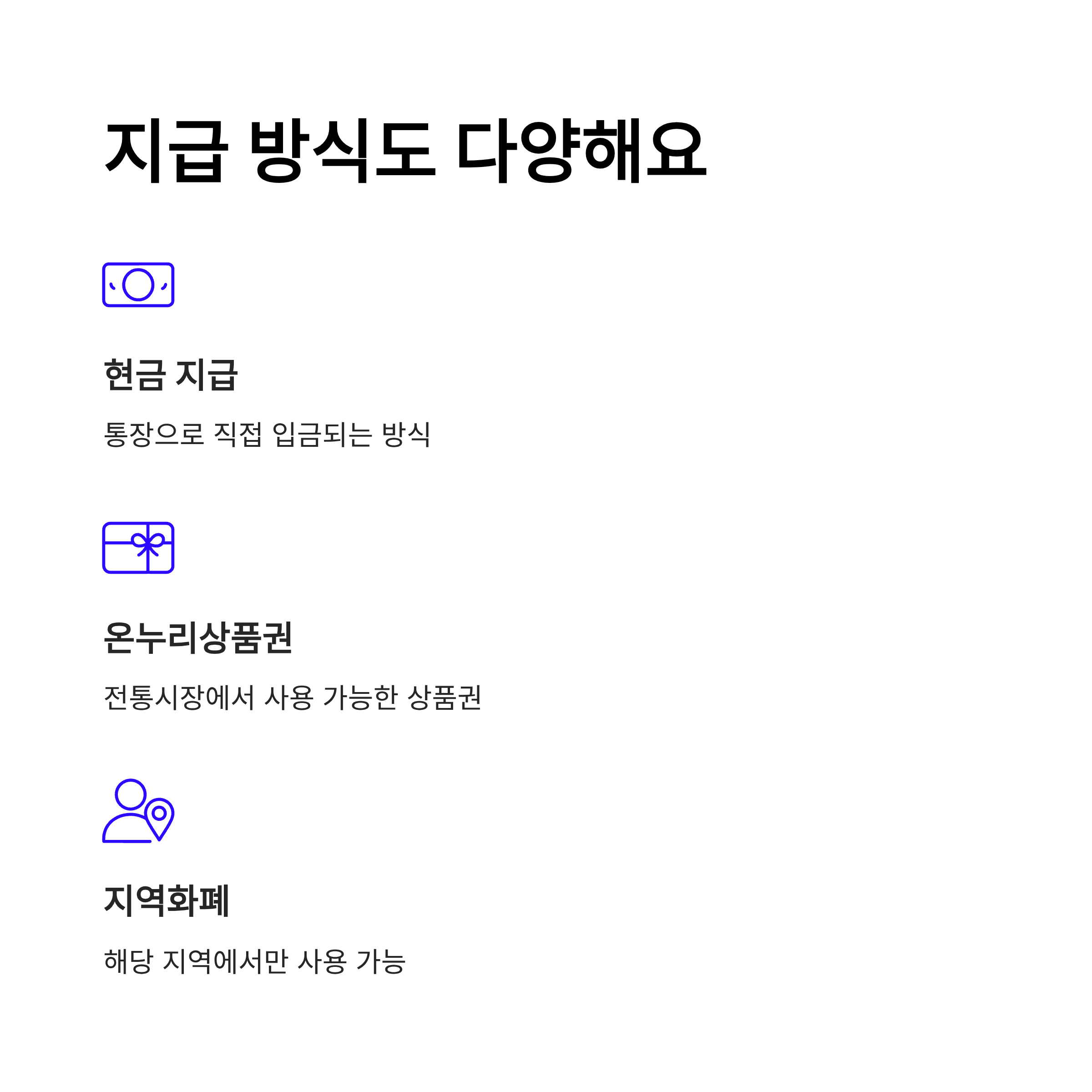 이처럼 금액은 지역의 재정 상황과 정책 방향에 따라 달라지므로, 본인이 거주하는 지역의 소식을 놓치지 말고 확인하는 것이 중요합니다. 특히 지급 수단도 현금, 온누리상품권, 지역화폐 등으로 다양하니 이점도 함께 확인하면 좋습니다.