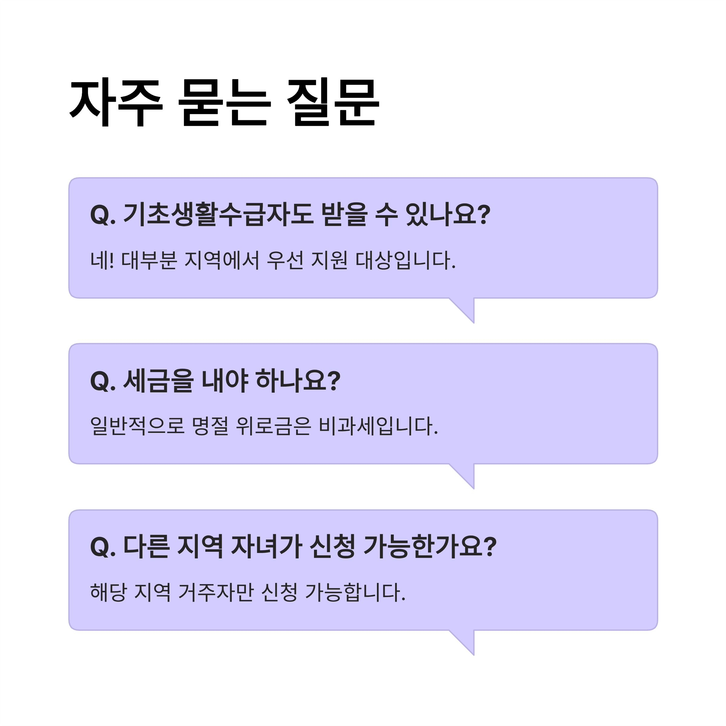 Q3. 지원금을 받으면 세금을 내야 하나요? A. 일반적으로 명절 위로금이나 생계지원금은 세금 부과 대상이 아니며, 소득으로 잡히지 않습니다. 하지만 소득세법상 과세 대상인지 여부는 정확히 확인해보시는 것이 좋습니다.