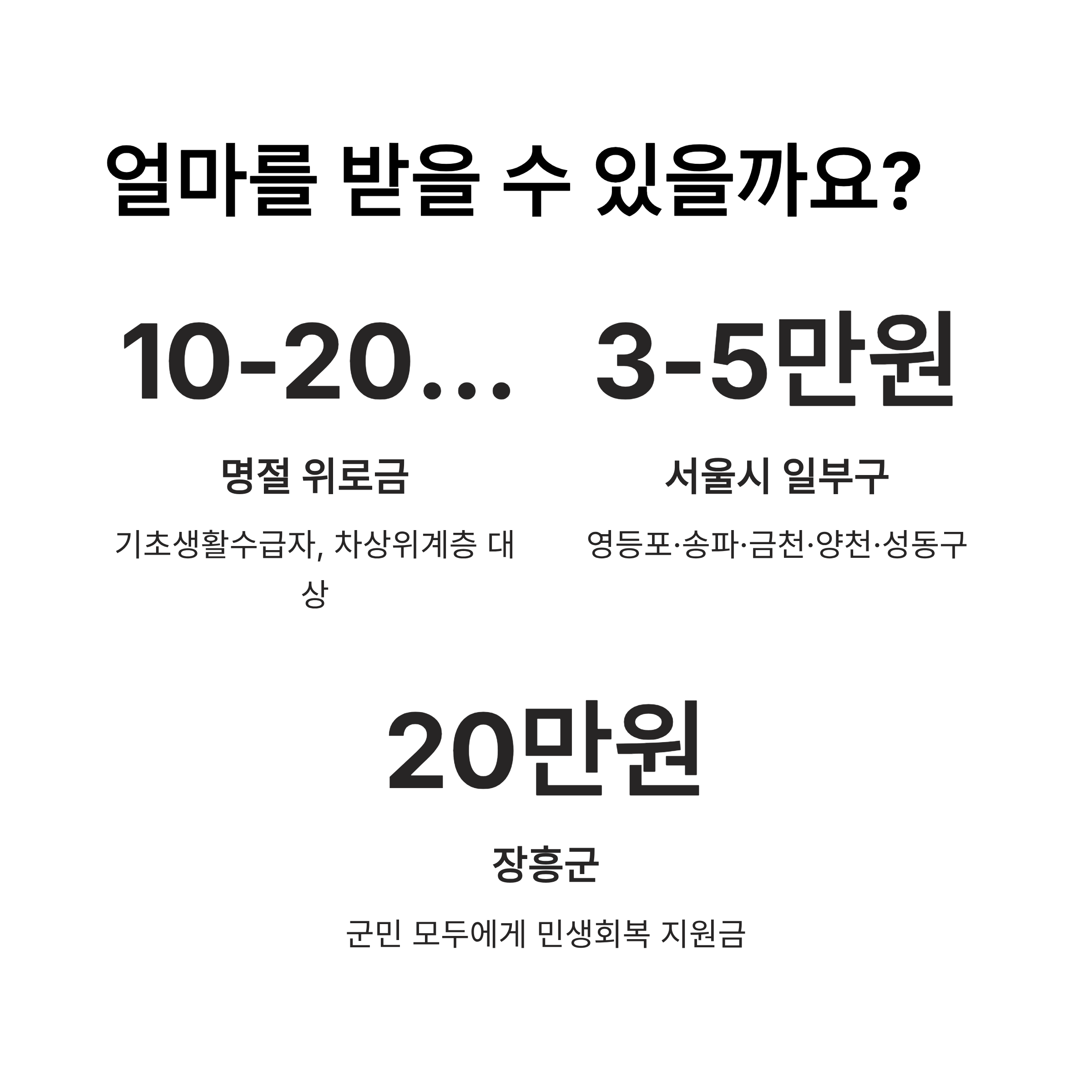 - 명절 위로금: 기초생활수급자, 차상위계층 등에게 지급되는 위로금은 대개 1인당 10만 원에서 20만 원 수준으로 책정되는 경우가 많습니다. 가구원 수에 따라 금액이 늘어나기도 합니다.