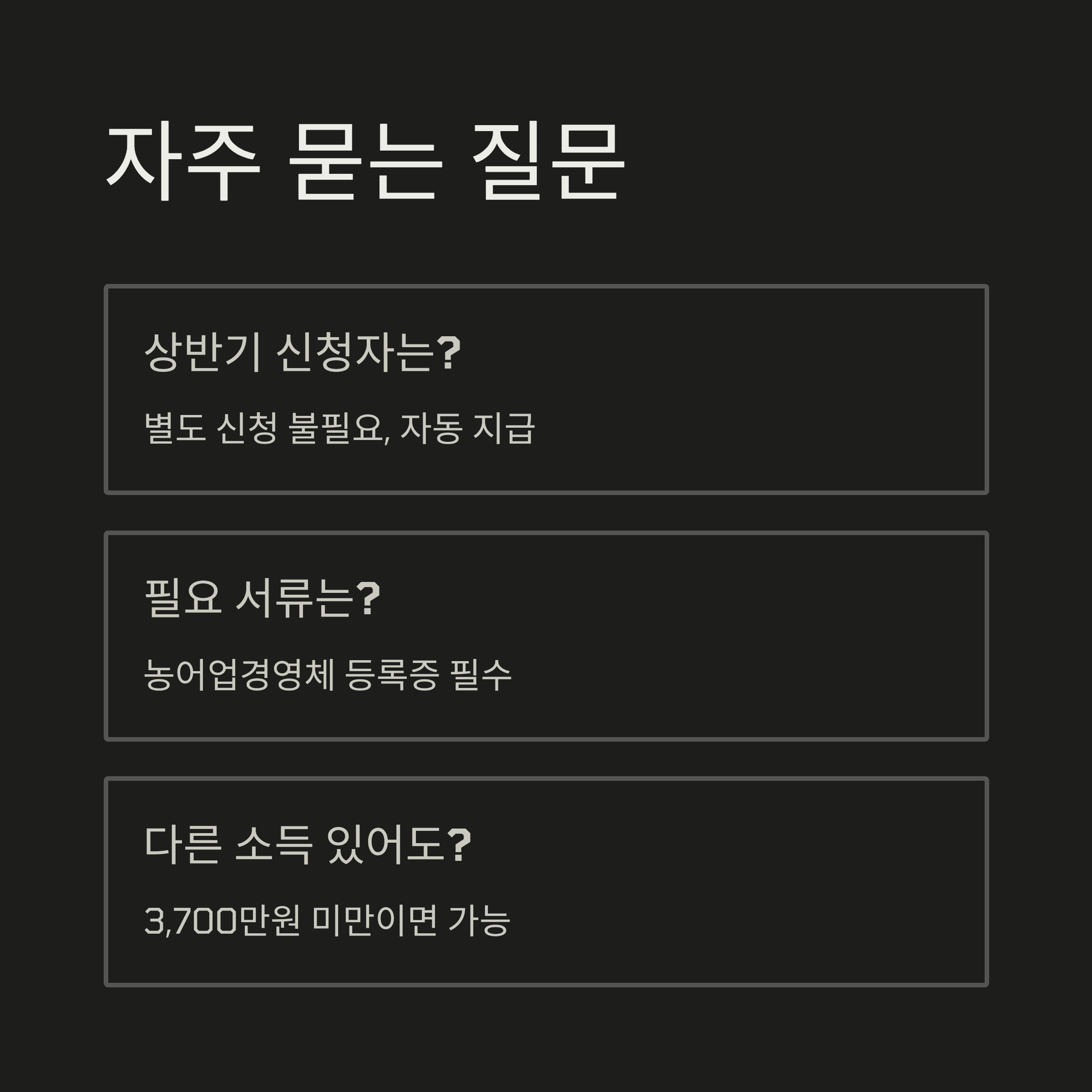 - 소득 요건: 농어업 외 종합소득이 3,700만 원 미만이어야 합니다.