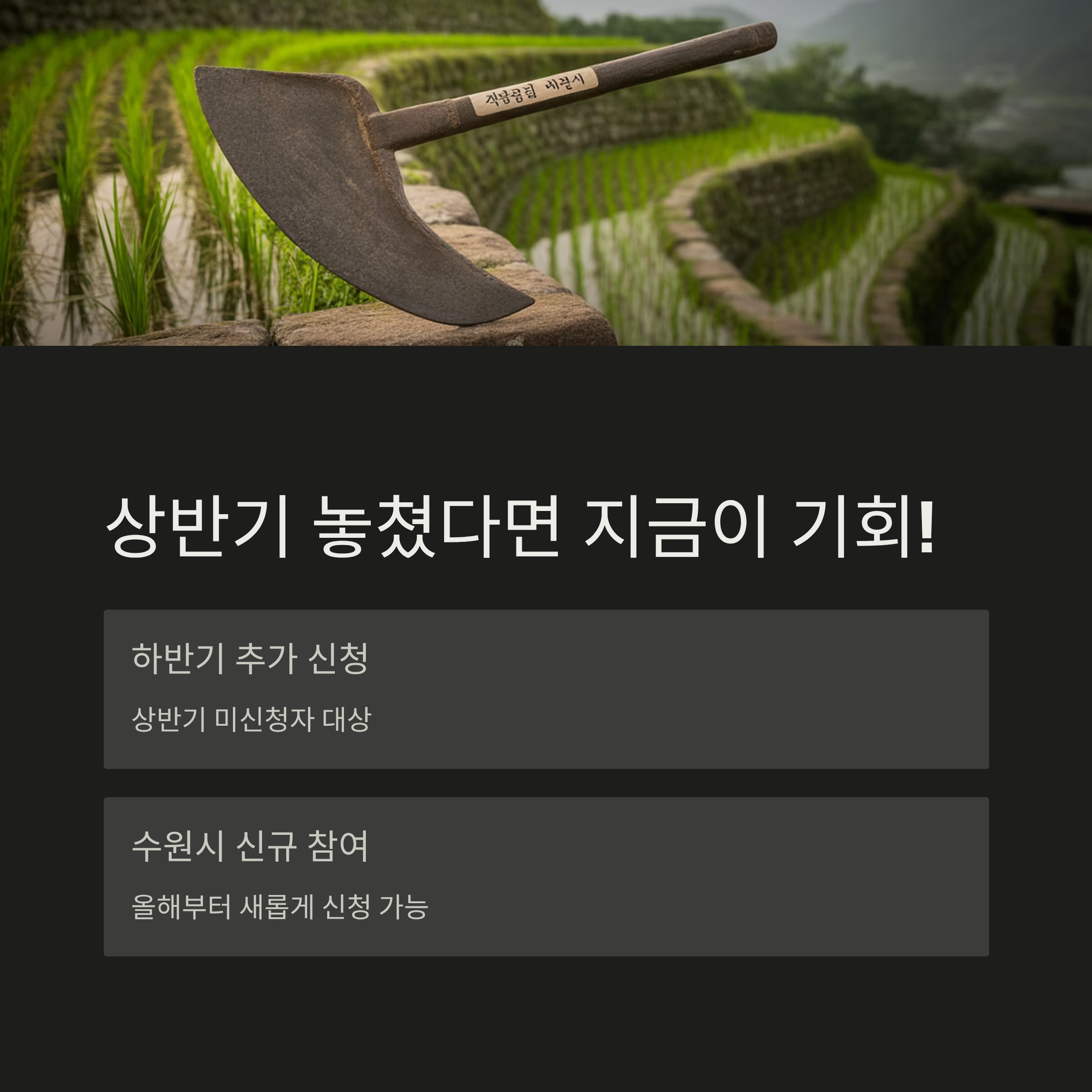 신청 후에는 서류 심사와 현장 심사를 거쳐 11월에 최종 지급 대상자가 결정되고, 12월에 지역화폐로 일괄 지급될 예정입니다. 참고로, 하반기부터 새롭게 참여하는 수원시 농어민에게는 6개월분이 지급되니 이 점도 꼭 기억해 주세요.