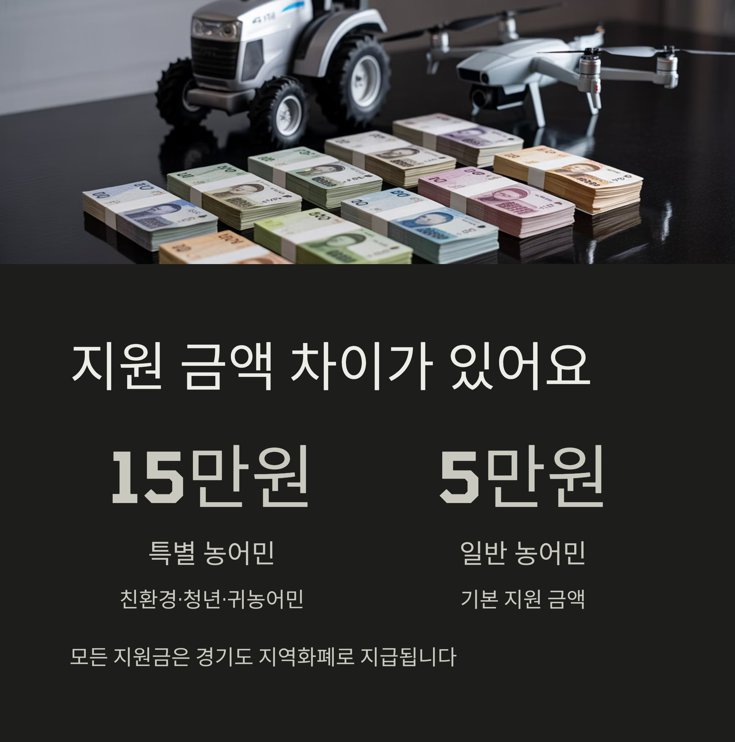 또한, 지원 금액은 농어민 유형에 따라 달라지는데요. 친환경 농어민, 청년 농어민(만 50세 미만, 단 40세 이상 50세 미만은 농어업경영체 등록 10년 이내), 그리고 귀농·귀어한 지 5년 이내인 분들은 월 15만 원을, 그 외 일반 농어민은 월 5만 원을 경기도 지역화폐로 받게 됩니다.