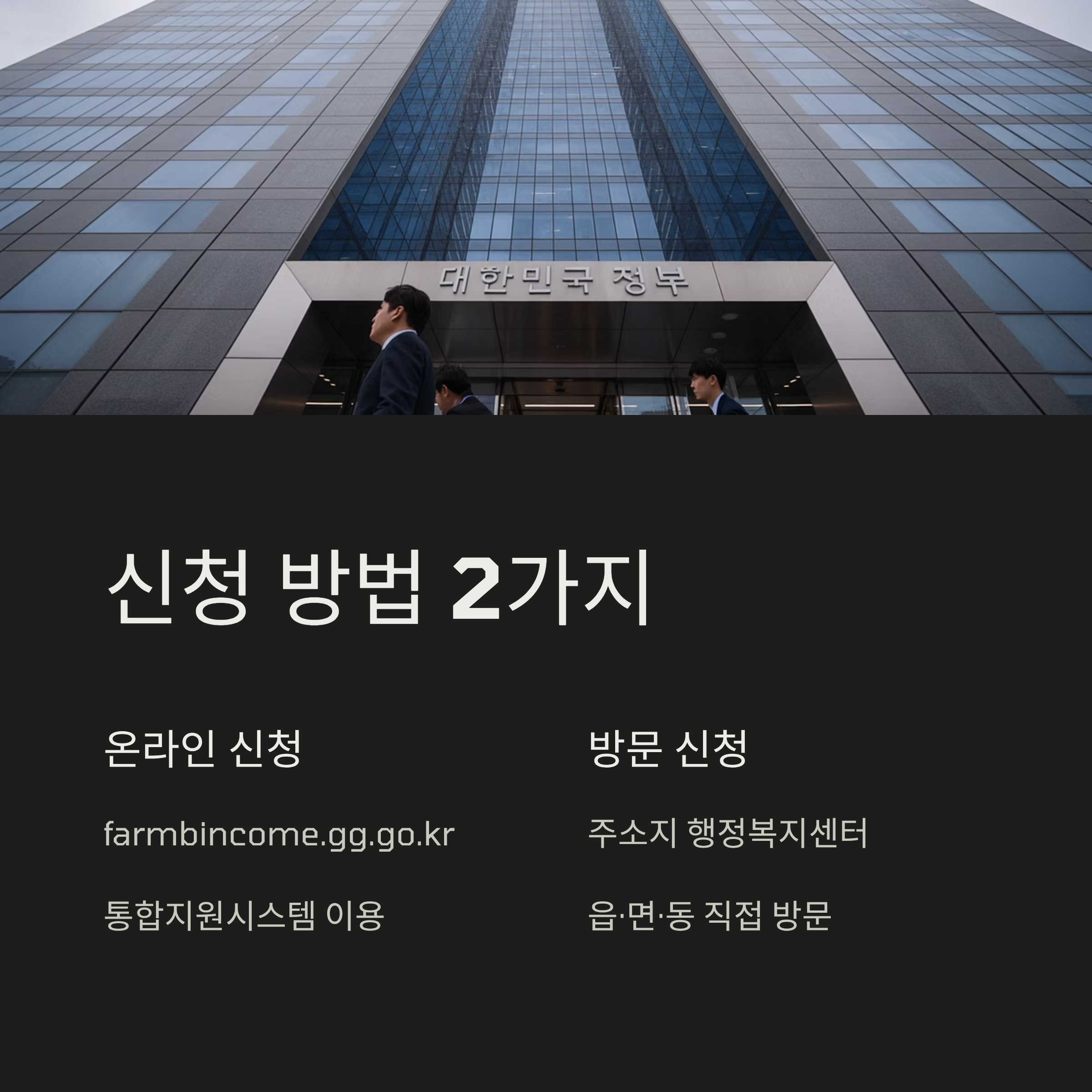 - 온라인 신청: '경기도 농어민 기회소득 통합지원시스템(farmbincome.gg.go.kr)'을 통해 간편하게 신청할 수 있습니다.