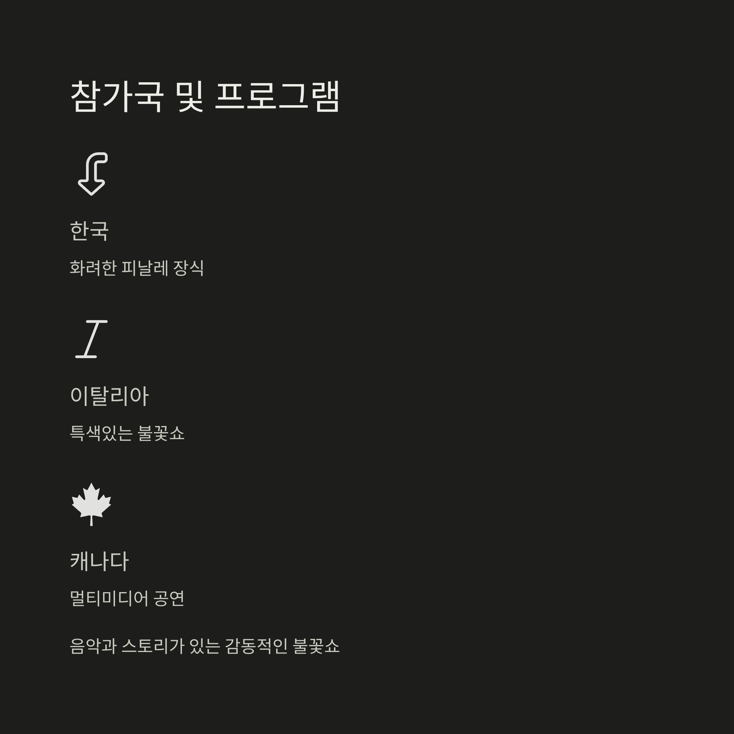 이번 축제에는 한국을 포함해 이탈리아, 캐나다 총 3개국이 참가하여 각국의 특색 있는 불꽃 쇼를 선보입니다. 특히 한국 팀은 가장 화려한 피날레를 장식할 예정이라 더욱 기대가 되는데요. 단순히 불꽃만 터뜨리는 것이 아니라, 음악과 스토리가 있는 멀티미디어 불꽃쇼로 구성되어 마치 한 편의 영화를 보는 듯한 감동을 선사할 것입니다. 환상적인 불꽃쇼를 눈과 귀로 즐길 준비 되셨나요?