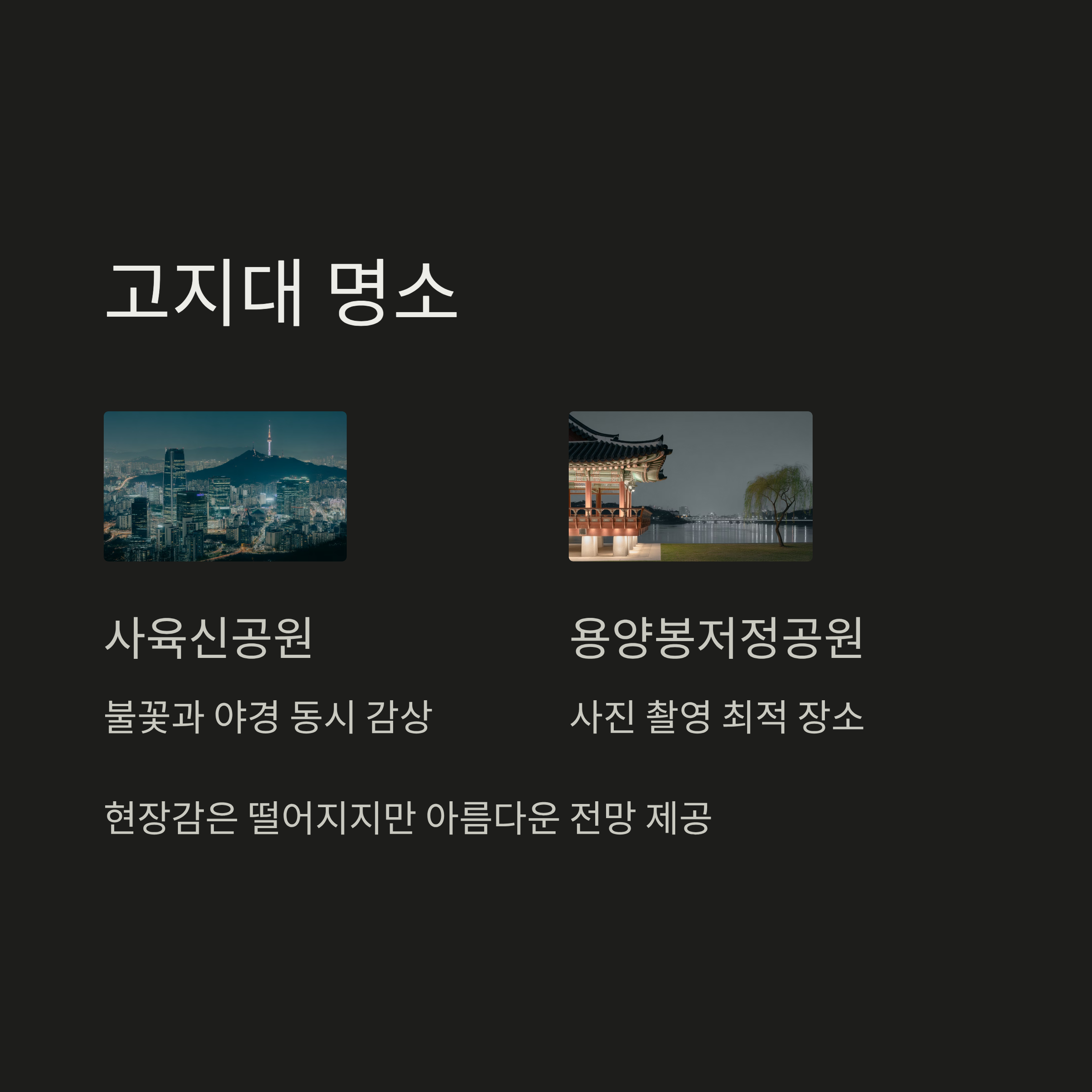 - 장점: 불꽃과 함께 서울의 아름다운 야경을 함께 감상할 수 있습니다. 특히 사진 찍기를 좋아하는 분들에게 추천하는 장소입니다.