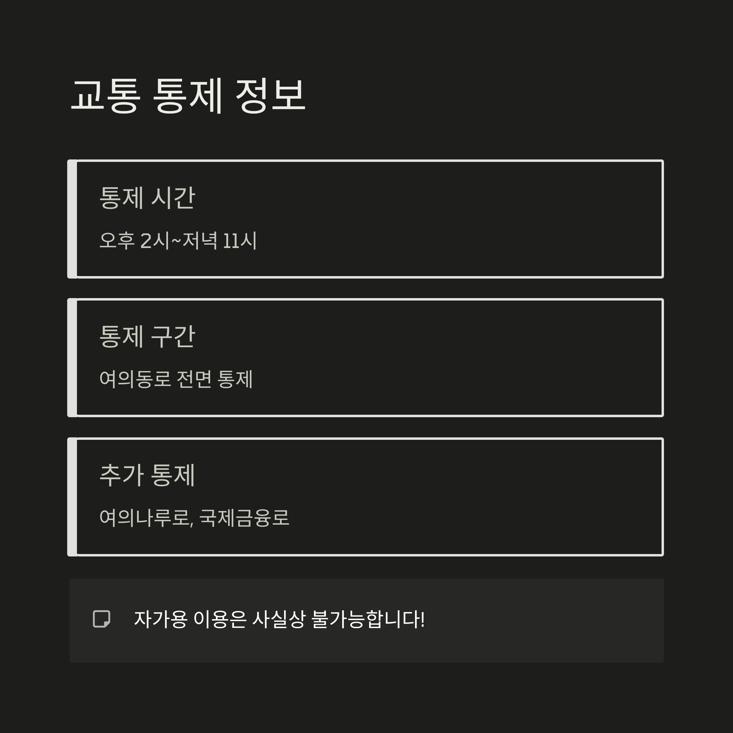 행사 당일인 9월 27일, 오후 2시부터 저녁 11시까지 여의도 한강공원 주변 도로인 **여의동로(마포대교 남단~63빌딩 앞)**가 전면 통제됩니다. 이외에도 여의나루로, 국제금융로 등 일부 구간이 상황에 따라 탄력적으로 통제될 수 있습니다. 자가용을 이용해 행사장에 오는 것은 사실상 불가능하다고 볼 수 있습니다.