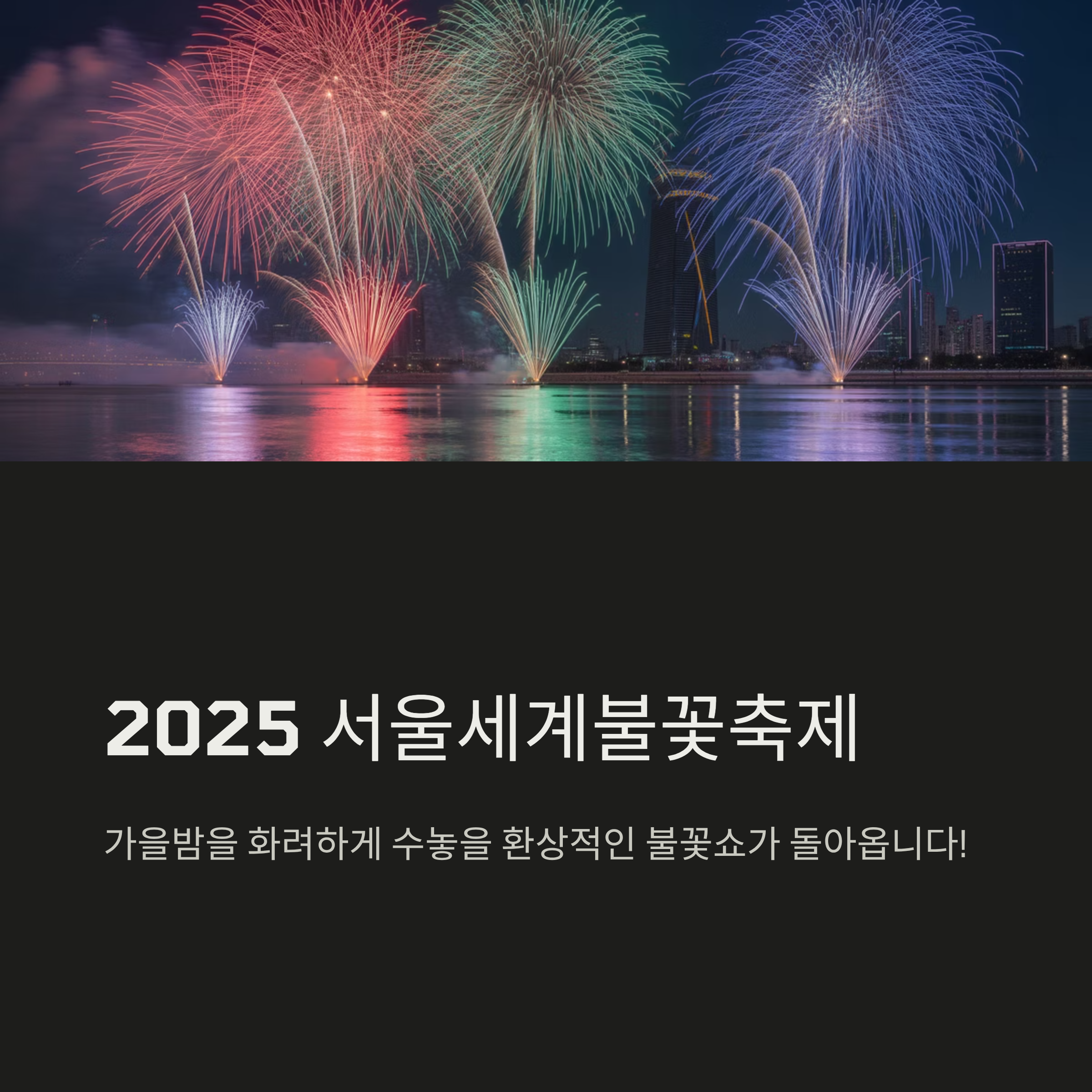 2025 서울세계불꽃축제는 단순한 불꽃놀이가 아니라, 모두가 함께 즐기고 감동을 나누는 특별한 축제입니다. 미리미리 준비해서 소중한 사람들과 잊지 못할 가을밤의 추억을 만들어보세요.
