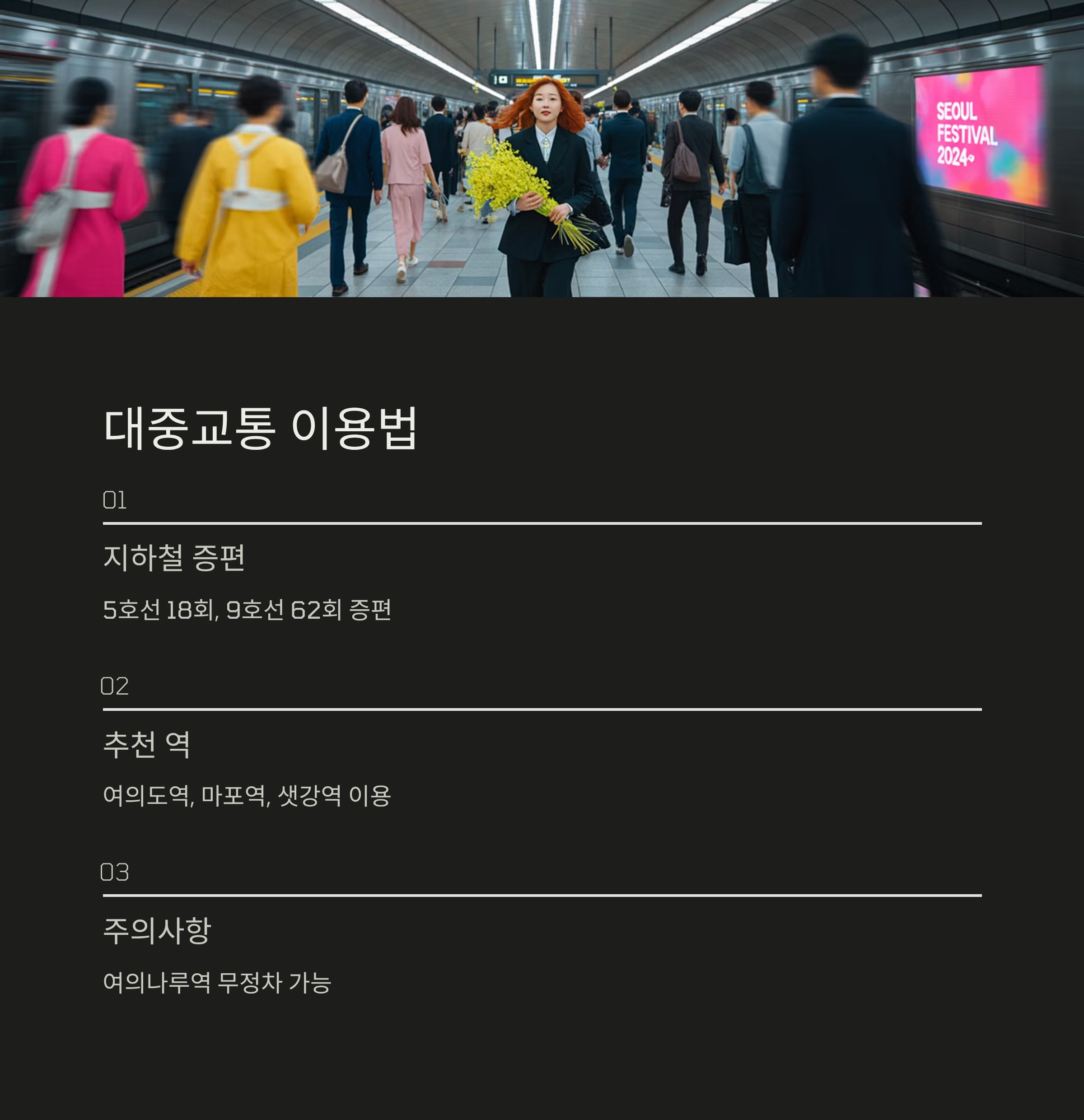 가장 좋은 방법은 지하철과 버스 등 대중교통을 이용하는 것입니다. 서울시는 축제 당일 5호선과 9호선을 각각 18회, 62회 증편 운행하여 관람객 편의를 높일 계획입니다. 하지만 여의나루역은 혼잡이 극심하여 안전상의 이유로 열차가 무정차 통과하거나 출입구가 폐쇄될 수 있습니다. 따라서 여의도역, 마포역, 샛강역 등 주변 역을 이용한 후 걸어오는 것을 추천합니다. 걷는 거리가 조금 있더라도 인파에 휩쓸리지 않고 비교적 안전하게 이동할 수 있습니다.