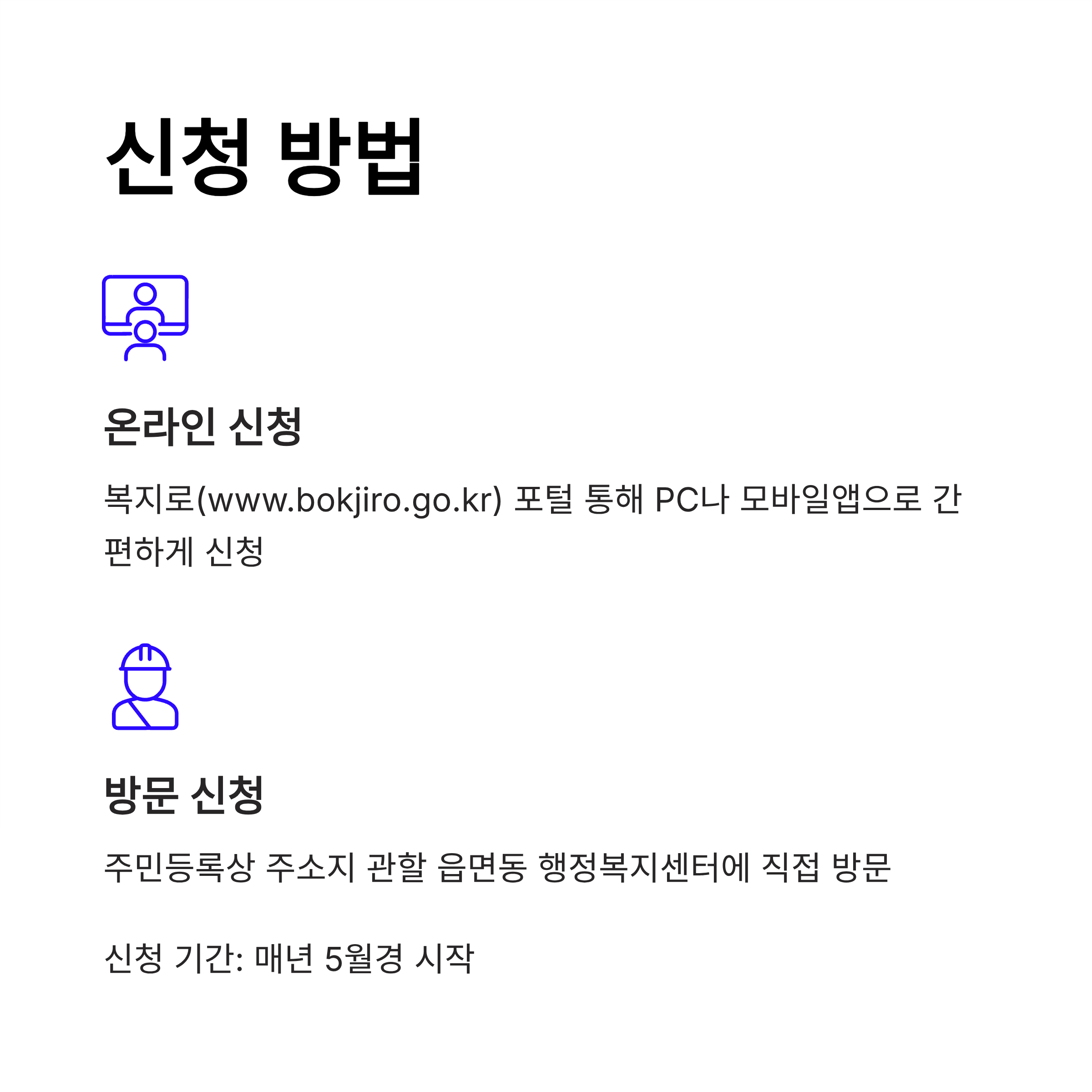 신청 방법은 크게 온라인과 방문 신청 두 가지가 있습니다.