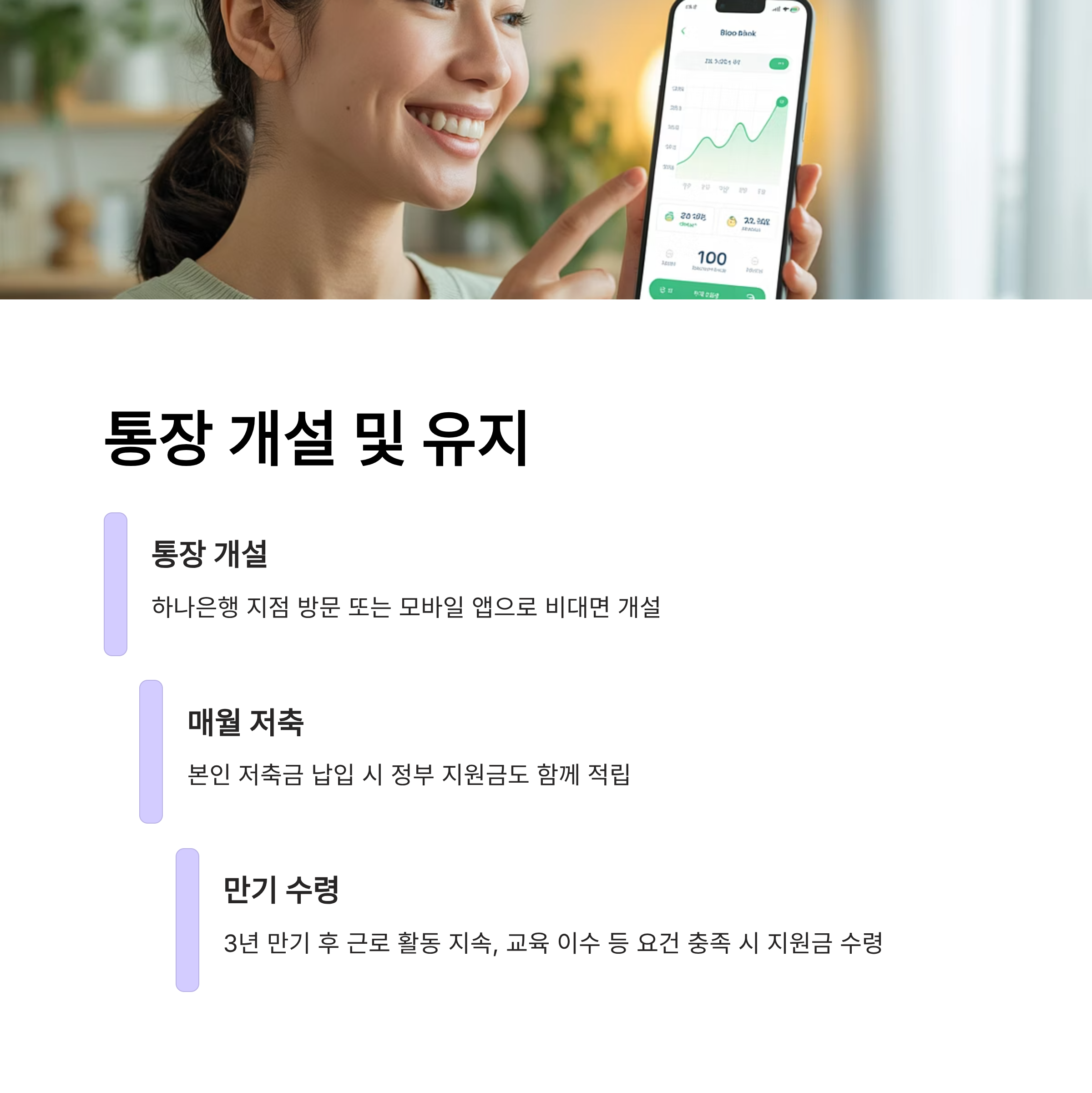 통장 개설은 하나은행 지점을 방문하거나 하나은행 모바일 앱을 통해 비대면으로도 가능합니다. 통장을 개설한 후에는 매월 본인 저축금을 납입하면 정부 지원금도 함께 적립됩니다. 3년 만기 후에는 근로 활동 지속, 교육 이수 등의 요건을 충족하면 지원금을 받을 수 있으니, 꾸준히 노력하는 자세가 필요하겠죠?
