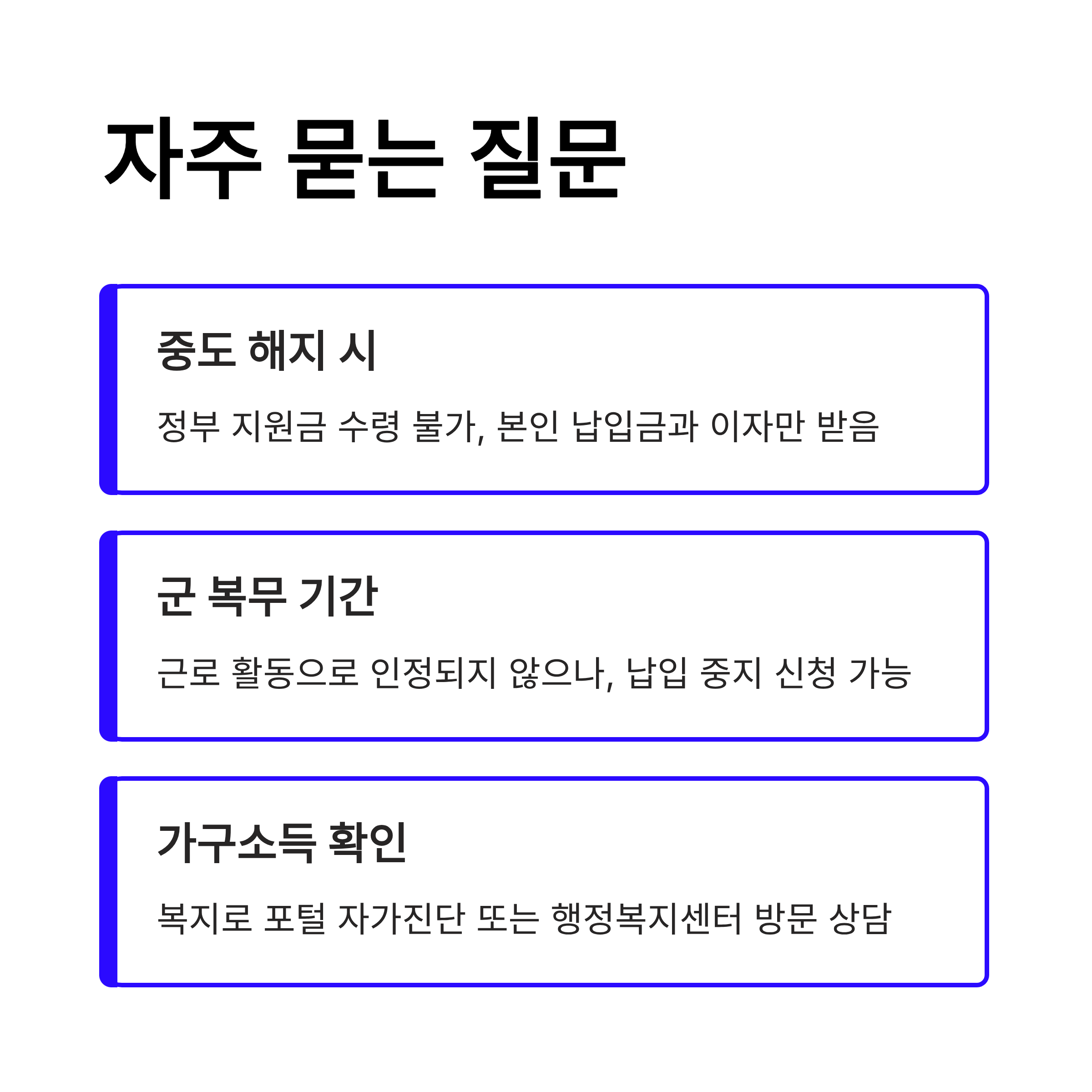 군 복무 기간은 근로 활동으로 인정받지 못하지만, 휴직, 육아휴직 등의 사유로 납입 중지를 신청할 수 있습니다. 자세한 내용은 신청 시 한국자활복지개발원 또는 읍면동 행정복지센터에 문의하시는 것이 좋습니다.