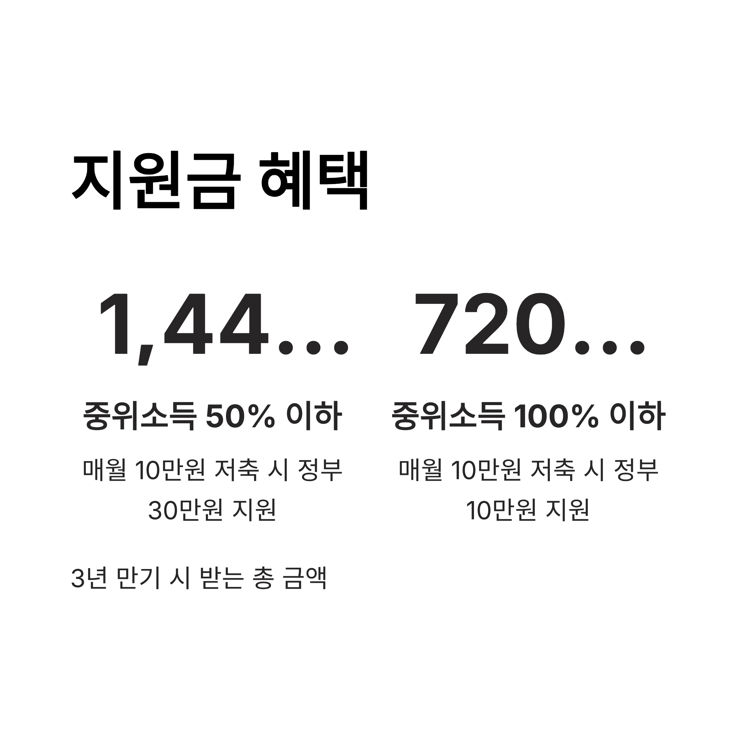 만약 여러분이 3년 동안 꾸준히 저축을 이어간다면, 본인 저축액에 정부 지원금이 더해져 엄청난 목돈을 만들 수 있습니다. 특히 기준 중위소득 50% 이하의 청년들은 매월 10만 원을 저축하면 정부가 30만 원을 지원해 주어 3년 후 1,440만 원이라는 큰돈을 마련할 수 있어요. 기준 중위소득 50% 초과 100% 이하의 청년들도 매월 10만 원 저축 시 10만 원을 지원받아 3년 뒤 720만 원의 목돈을 만들 수 있으니, 정말 좋은 기회죠! 이처럼 2026 청년내일저축계좌는 근로 빈곤층 청년들의 자산 형성을 돕는 중요한 정책으로 자리매김하고 있습니다.