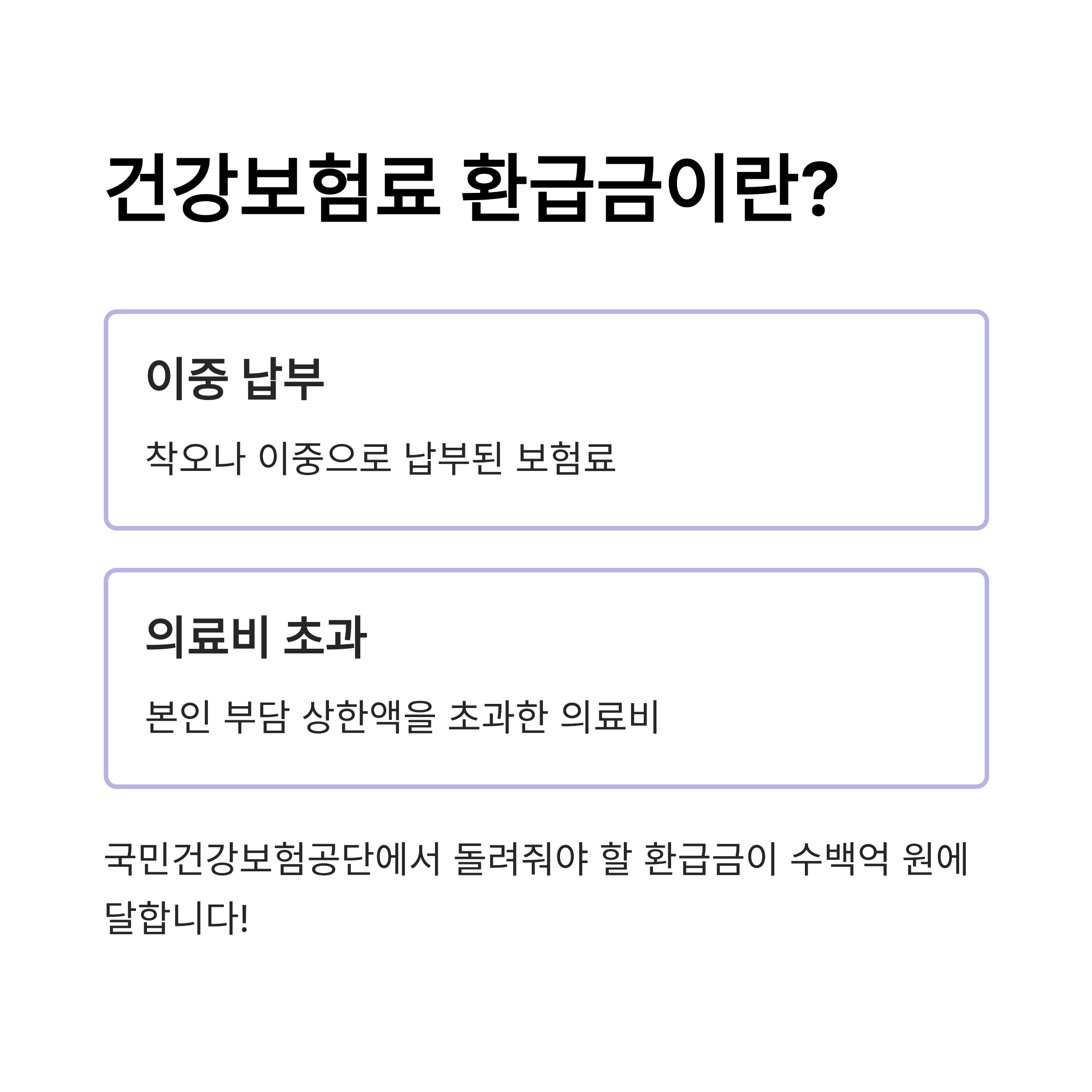 건강보험료 환급금은 크게 두 가지 유형으로 나눌 수 있습니다. 첫 번째는 '과오납 환급금'이고, 두 번째는 '본인부담상한제 환급금'입니다.