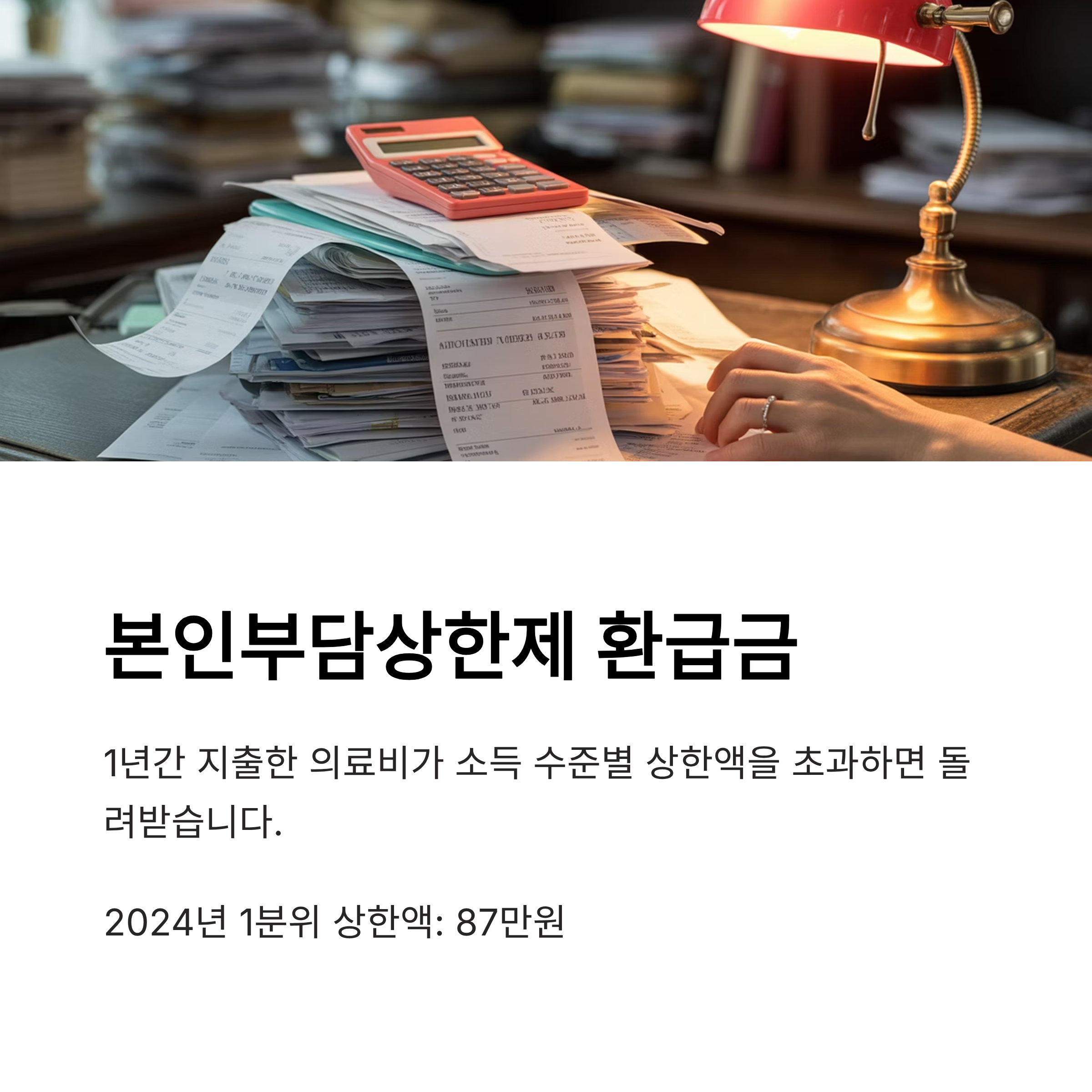 예를 들어, 2024년 기준 1분위(소득 하위 10%)의 본인부담 상한액은 87만원입니다. 만약 이 소득분위의 가입자가 병원비로 총 100만원을 지출했다면, 상한액 87만원을 제외한 13만원을 건강보험료 환급금으로 돌려받게 됩니다. 이렇게 큰 병원비가 발생했을 때 이 제도를 통해 가계 부담을 크게 줄일 수 있습니다.