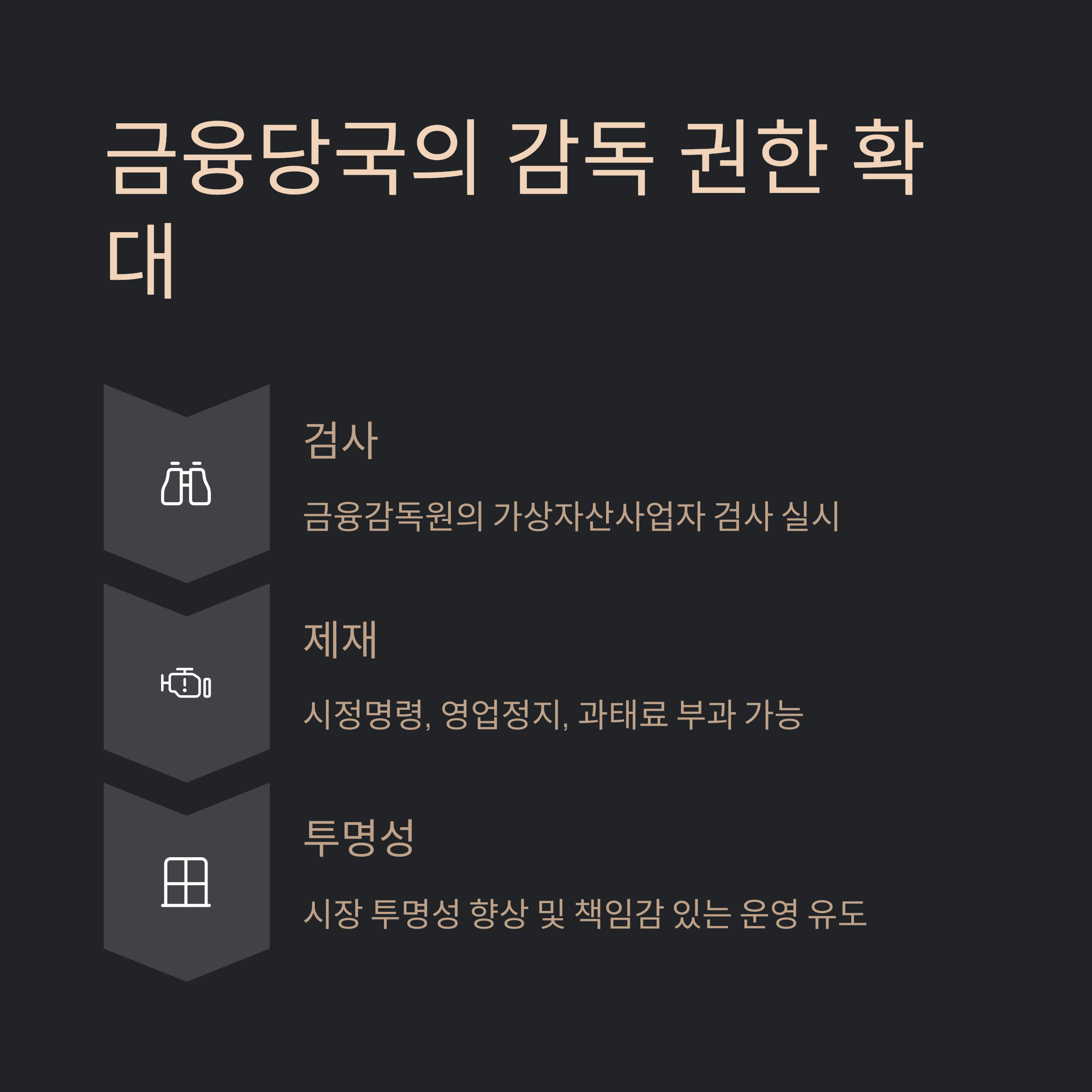 가상자산사업자들은 이제 금융당국의 엄격한 감독과 검사를 받게 됩니다. 금융감독원은 가상자산사업자를 대상으로 이용자 보호 의무 준수 여부 등을 검사하고, 금융위원회는 검사 결과에 따라 의무를 위반한 사업자에 대해 시정명령, 영업 정지, 과태료 부과 등 강력한 제재를 가할 수 있습니다. 이는 가상자산 시장의 투명성을 높이고, 사업자들이 책임감을 가지고 운영하도록 유도하는 중요한 장치가 될 것입니다.