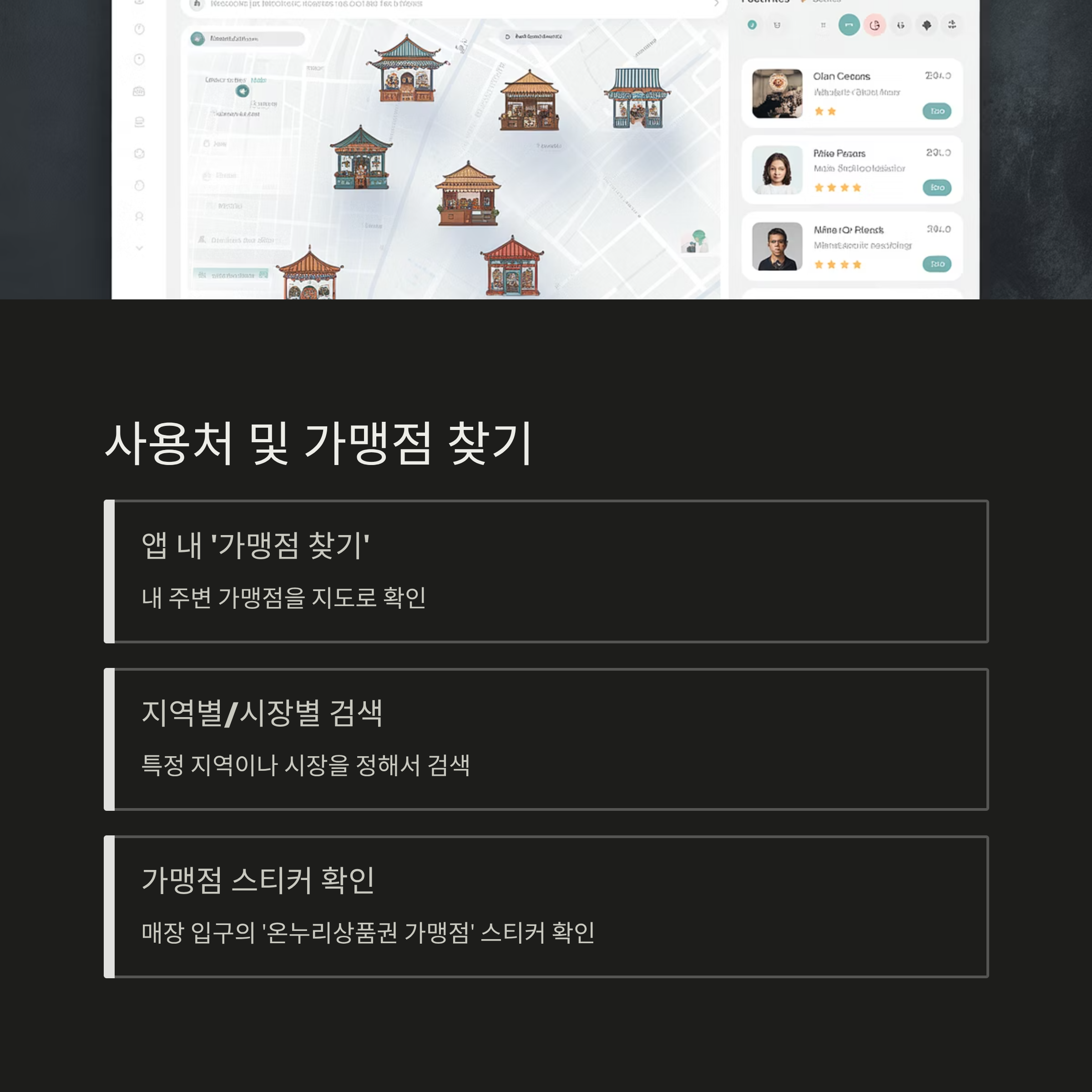 - 지역별/시장별 검색: 특정 지역이나 시장을 정해서 가맹점을 검색할 수도 있습니다.