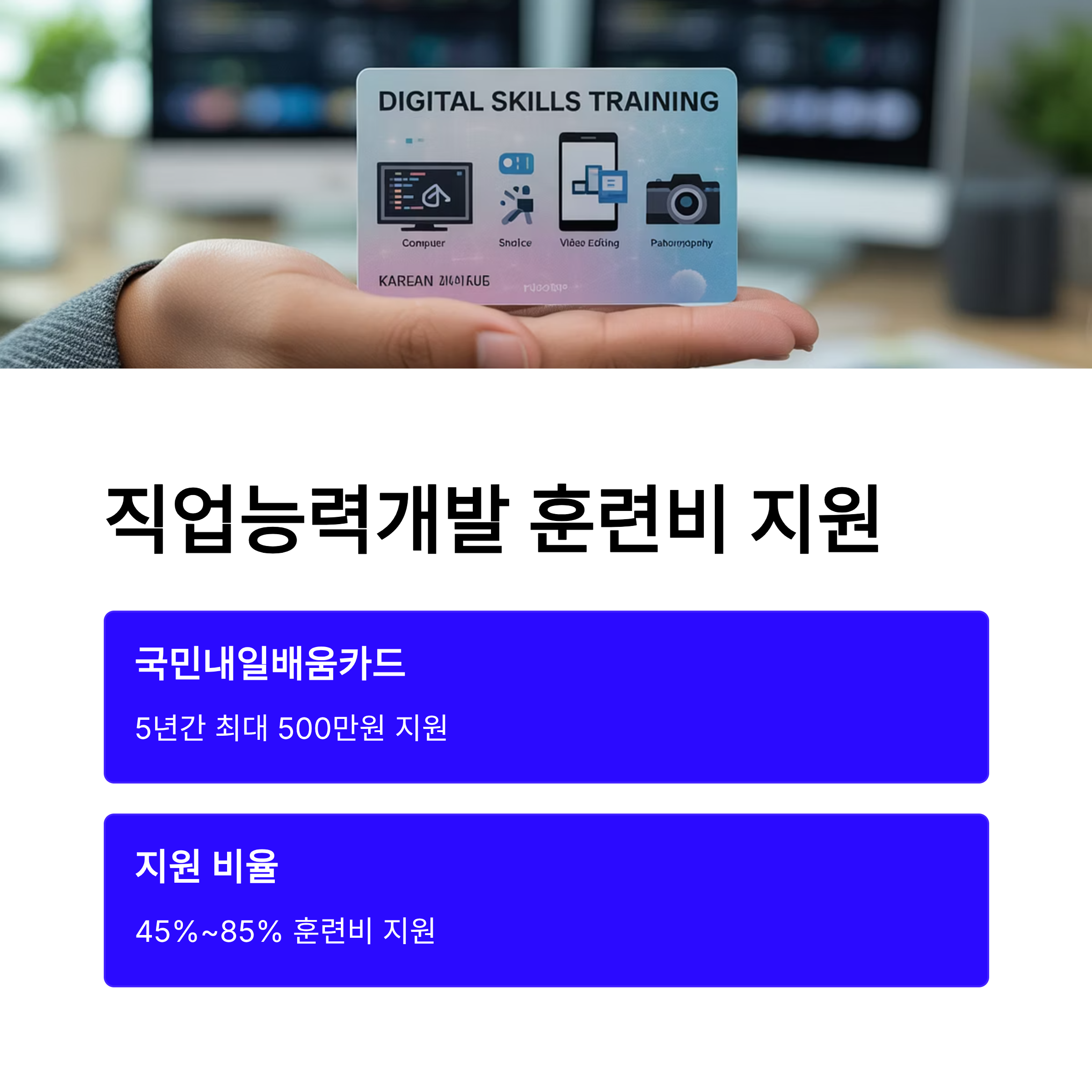고용보험은 단순히 실업 상태에 있을 때만 도움을 주는 것이 아닙니다. 재직 중인 근로자의 자기 계발과 직무 능력 향상을 위해 다양한 훈련비 지원 제도를 운영하고 있습니다. 바로 '국민내일배움카드'를 통해 지원받을 수 있는 직업능력개발 훈련비 지원인데요. 재직자라면 누구나 고용보험 가입 여부와 관계없이 국민내일배움카드를 발급받아 훈련비를 지원받을 수 있습니다.