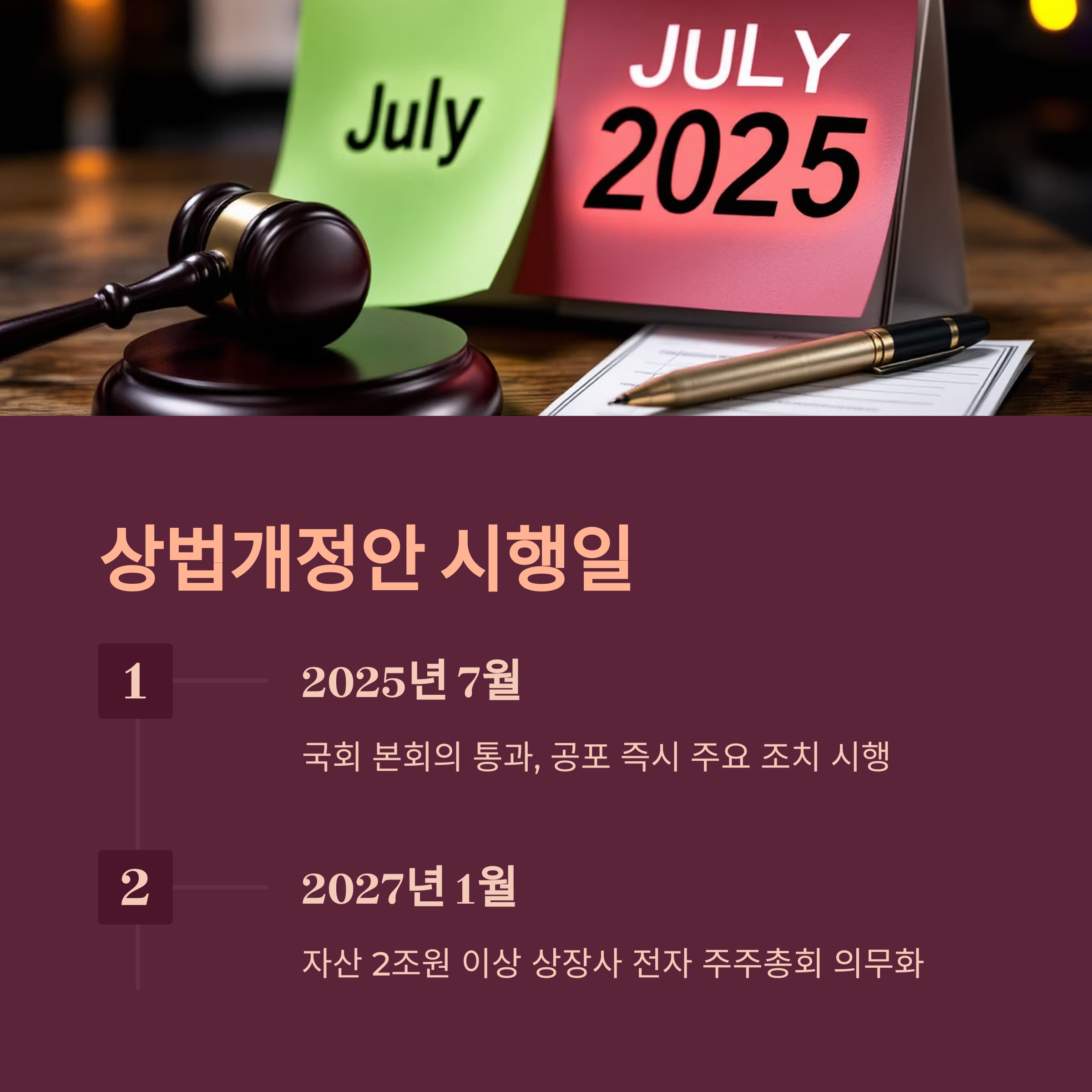→ 2025년 7월 3일 국회 본회의 통과, 공포 즉시 시행. 전자주총 의무화는 2027년 1월 1일부터 적용.