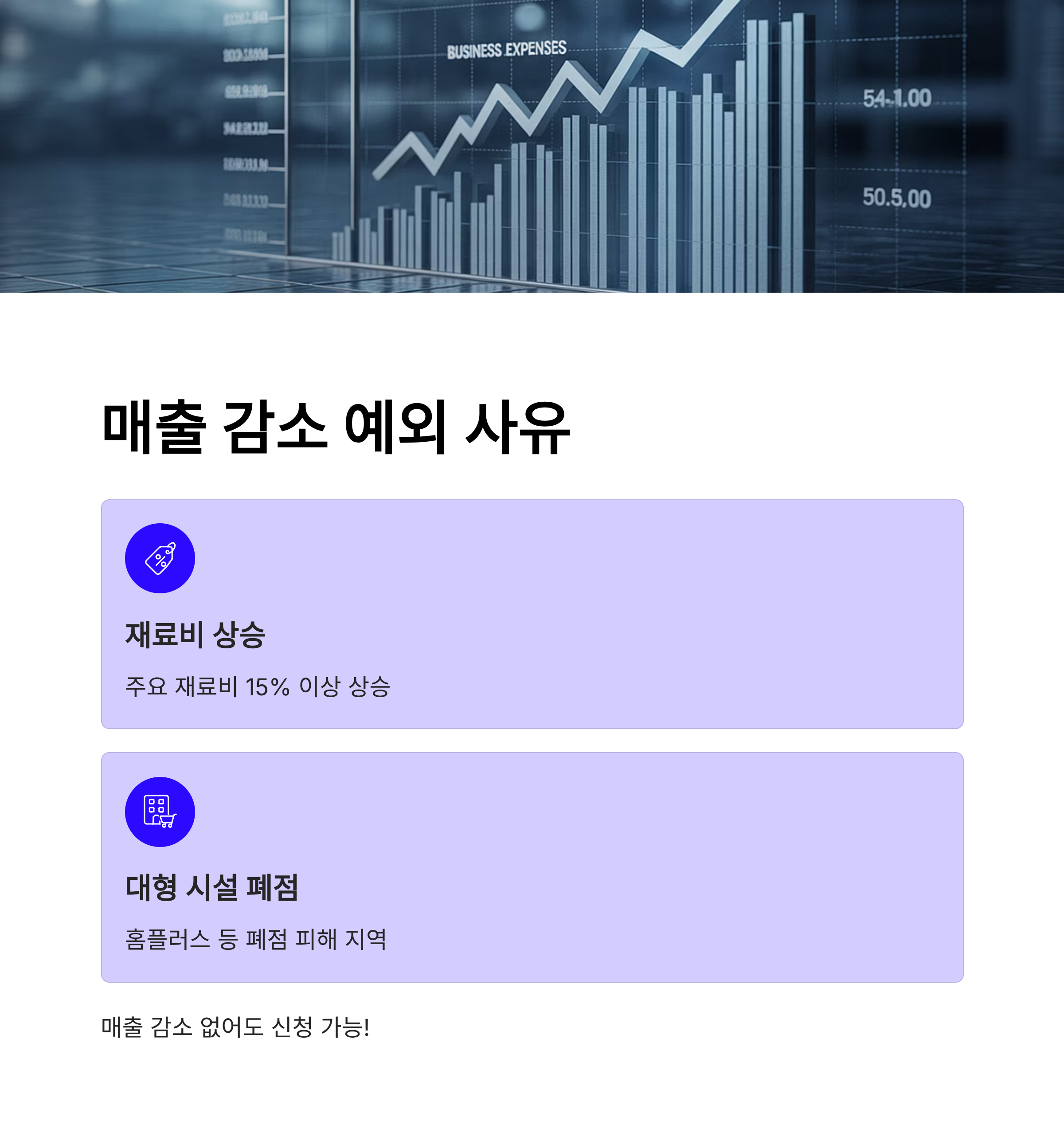 특히 재료비 단가 상승으로 어려움을 겪는 분들이라면, 매출 감소 여부와 상관없이 신청할 수 있는 좋은 기회이므로 이 부분을 꼭 체크해 보시기 바랍니다.