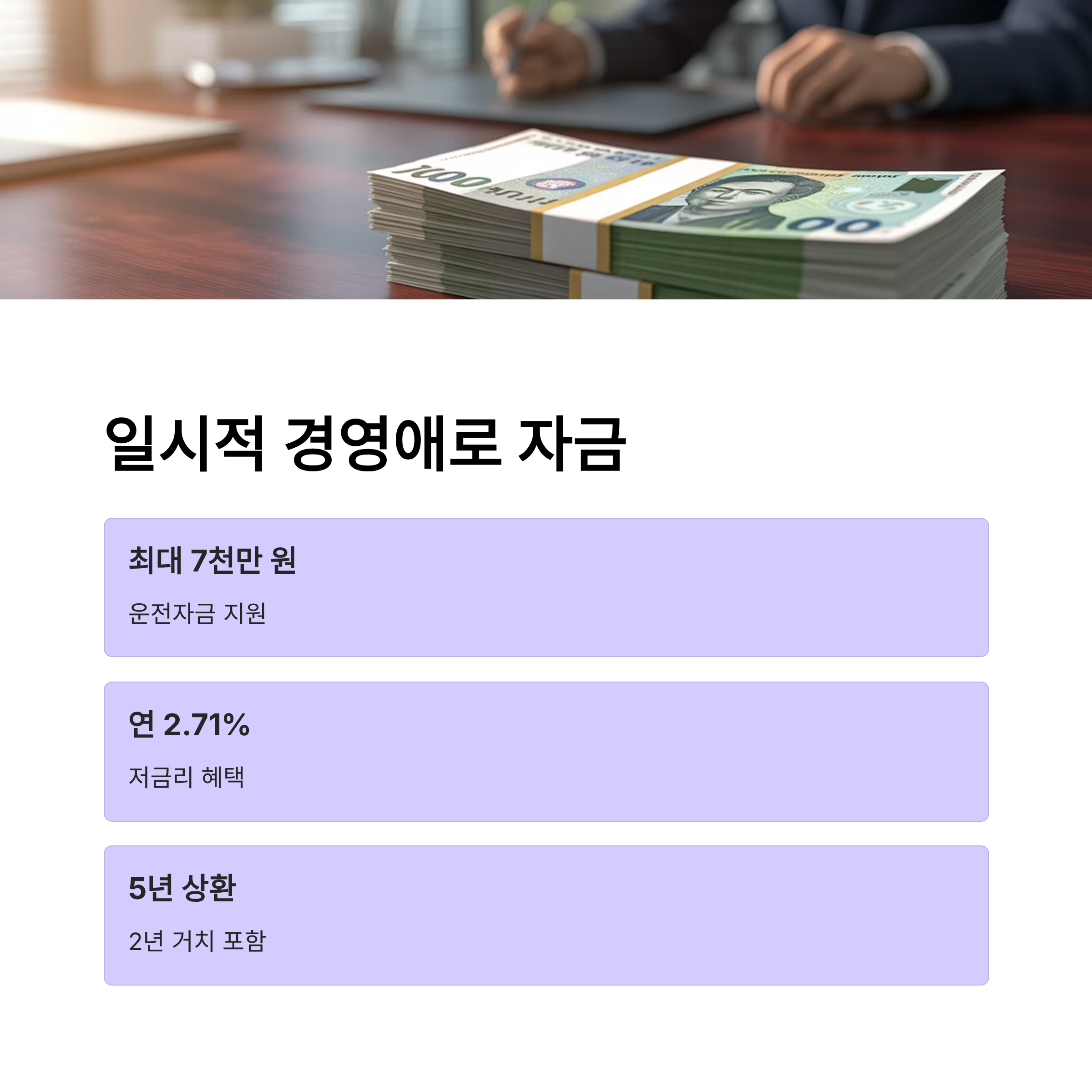 소상공인 사장님들께 속보를 전합니다. 정부가 경기 침체 등으로 인해 일시적으로 어려움을 겪는 소상공인들을 위해 직접 대출 방식의 특별 정책자금을 발표했습니다. 바로 '일시적 경영애로 자금'인데요, 낮은 금리와 안정적인 상환 조건으로 긴급 운영 자금이 필요한 분들에게는 가뭄의 단비와 같은 소식입니다.