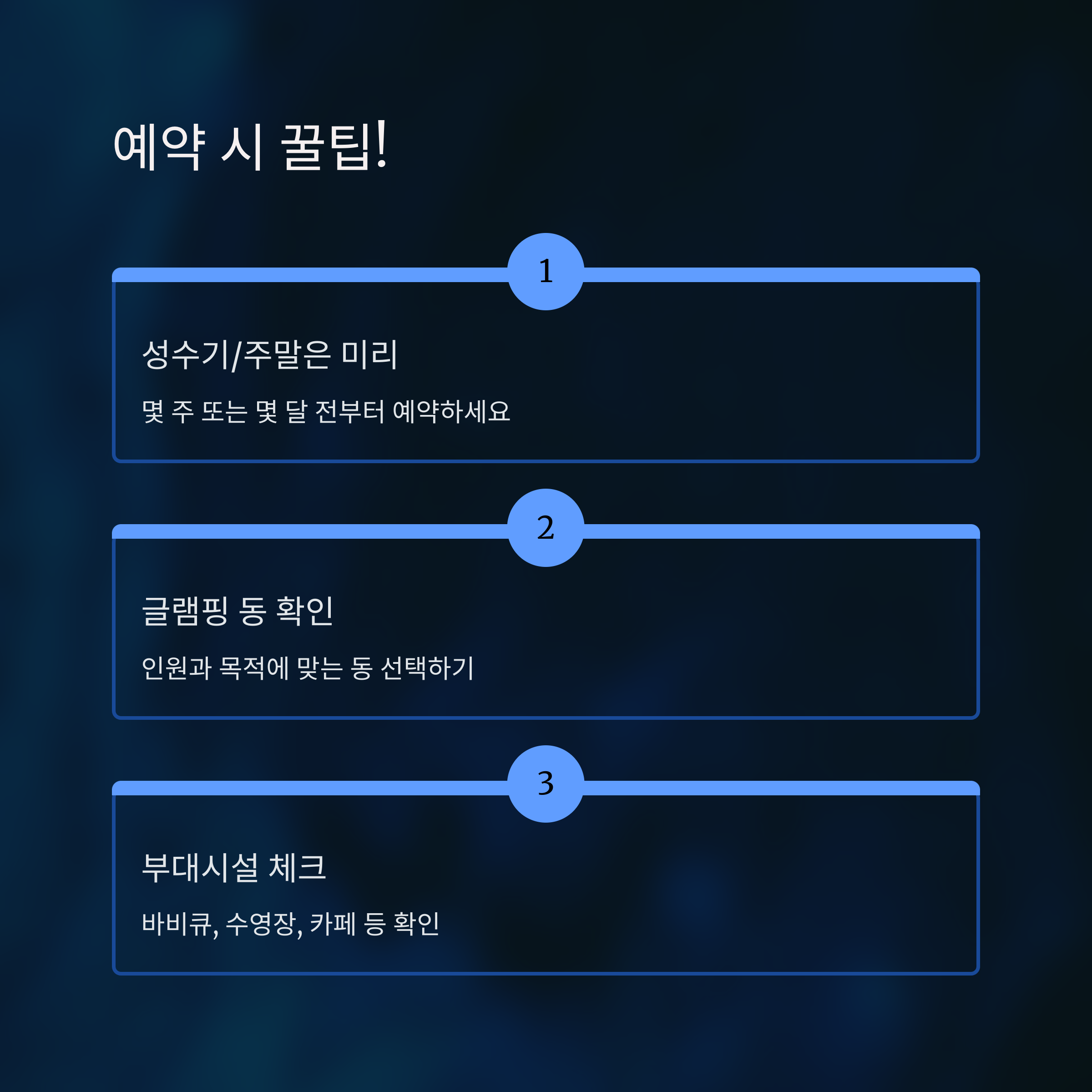 - 성수기 및 주말 예약은 미리미리: 특히 여름휴가 시즌이나 단풍놀이 시즌 같은 성수기, 그리고 주말 예약은 몇 주 혹은 몇 달 전부터 마감되는 경우가 많습니다. 여유롭게 여행을 즐기시려면 미리 계획을 세우고 예약하는 것이 현명합니다.