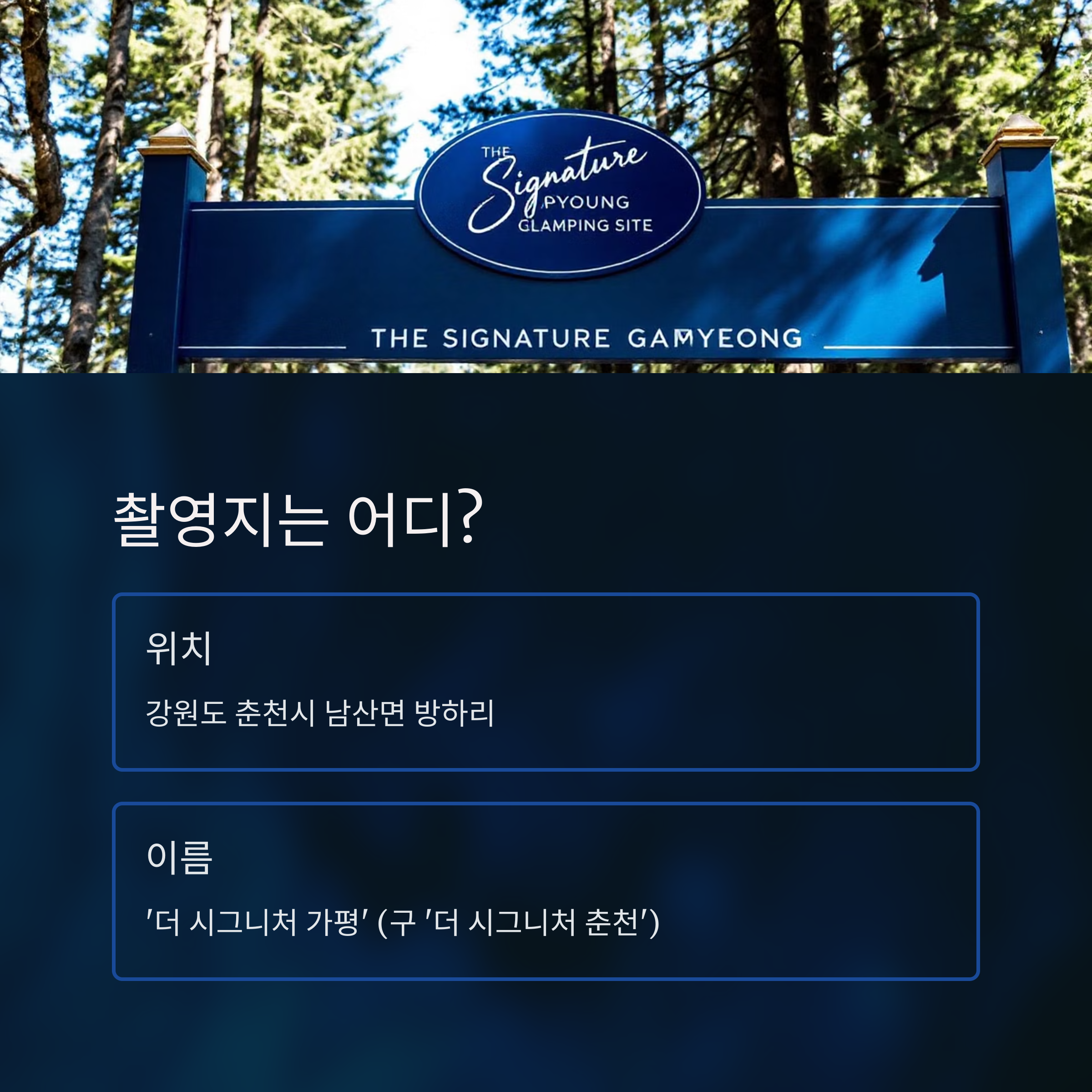 '유재석 캠프' 촬영지인 '더 시그니처 가평'에 방문하시면 방송에서 보셨던 감동을 직접 느낄 수 있을 거예요.